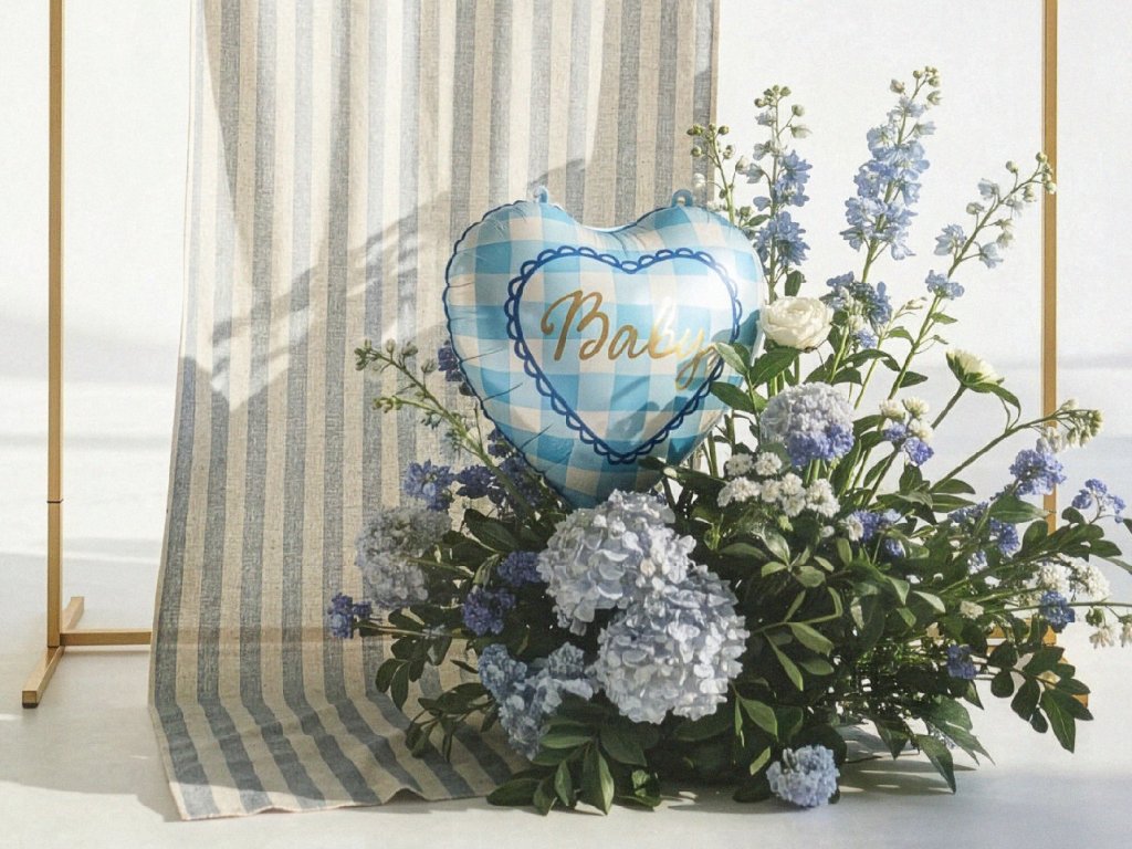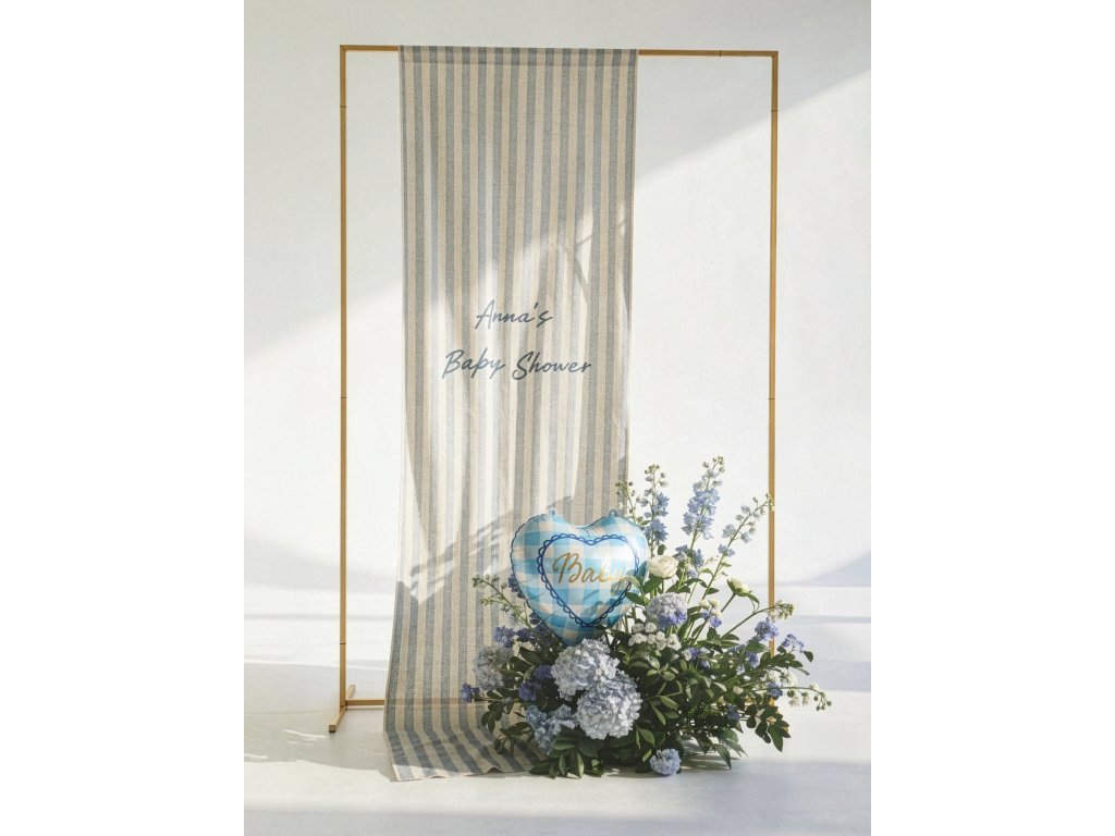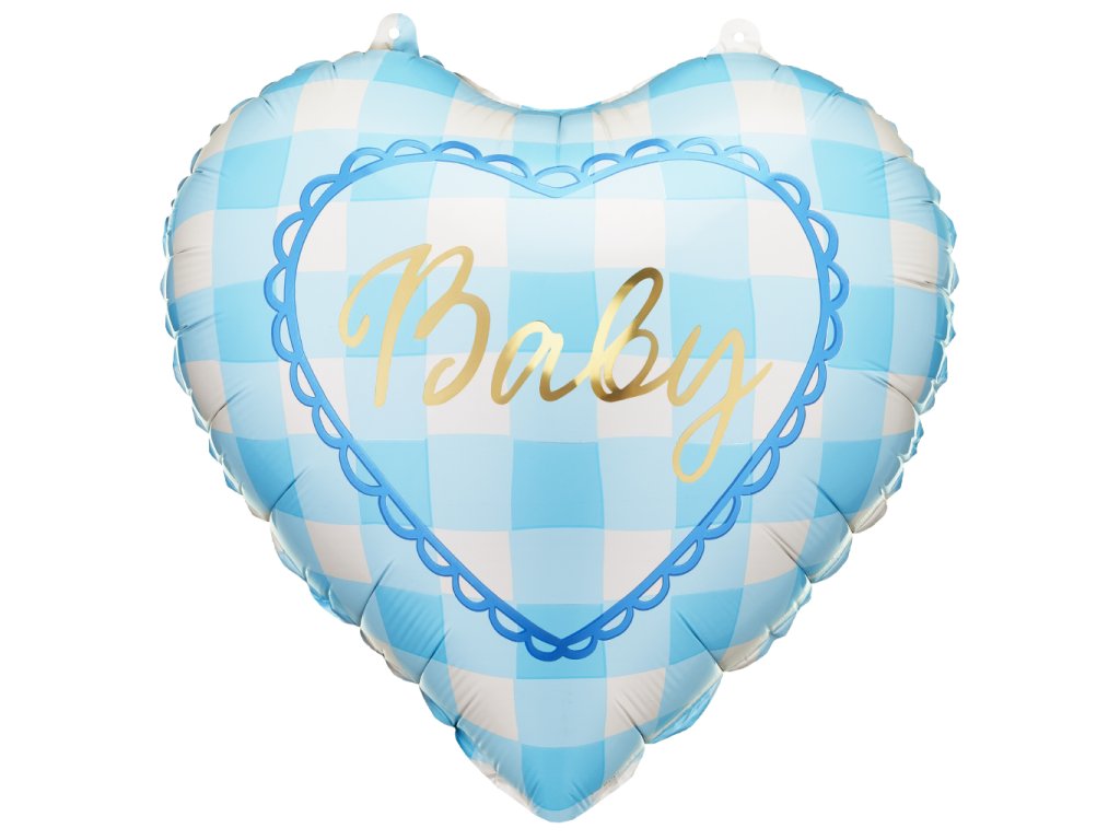 Fóliový balonek ve tvaru srdce se světle modrým vzorem a zlatým nápisem Baby, velikost 45 cm.