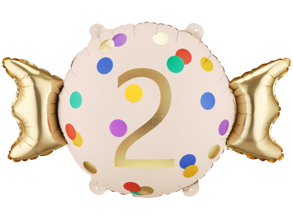 Fóliový balonek ve tvaru bonbonu s číslem 2 v béžovo-zlaté barvě s barevnými tečkami, velikost 76,5 x 48 cm.