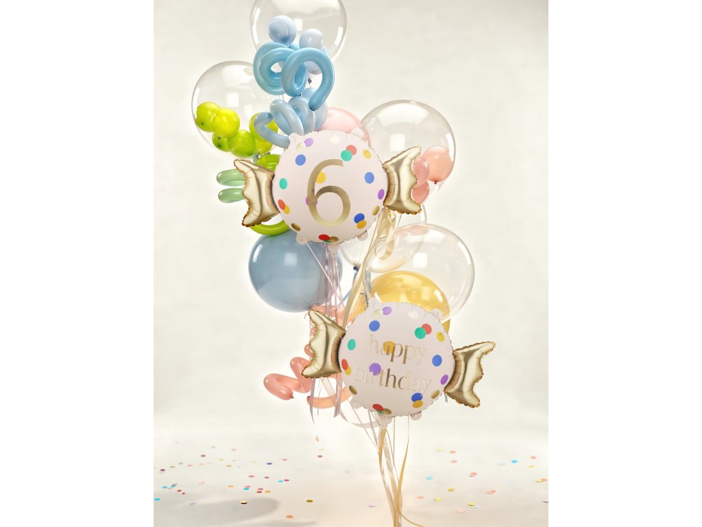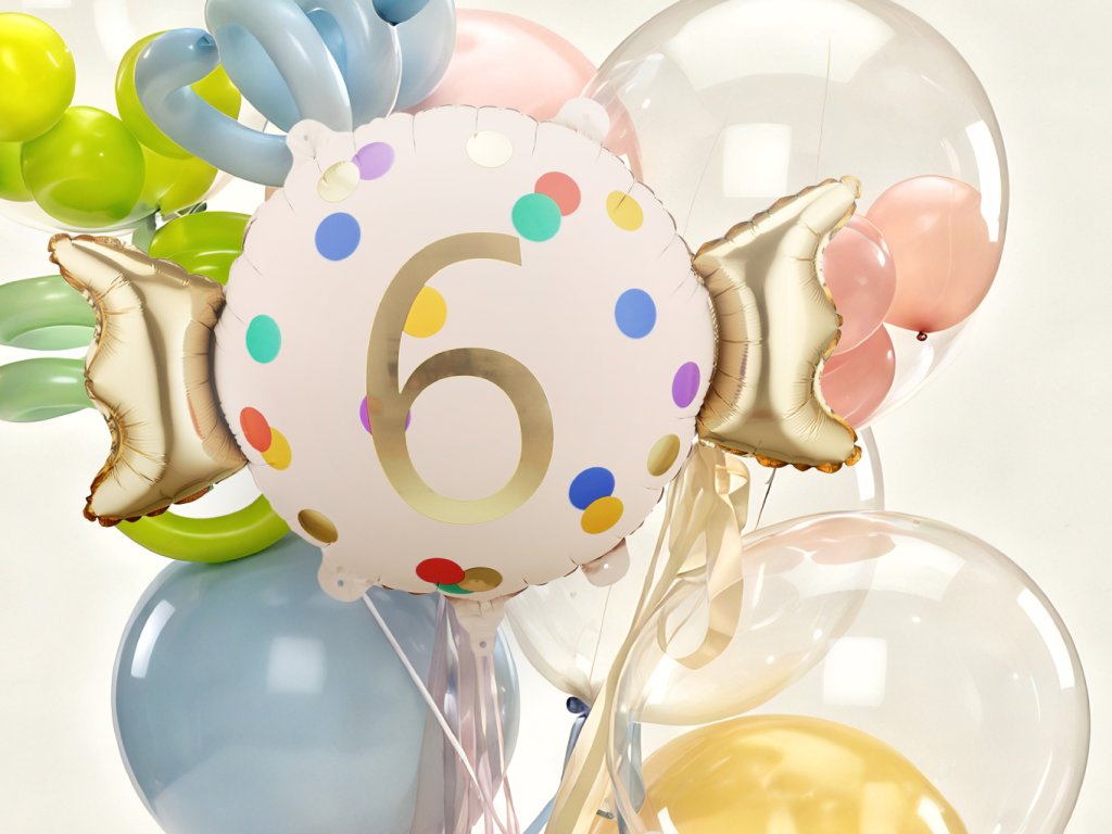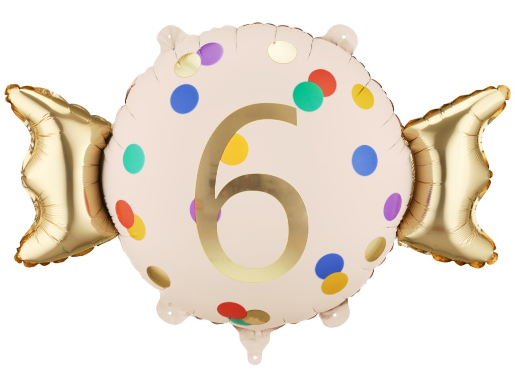 Fóliový balonek ve tvaru bonbonu s číslem 6 v béžovo-zlaté barvě s barevnými tečkami, velikost 76,5 x 48 cm.