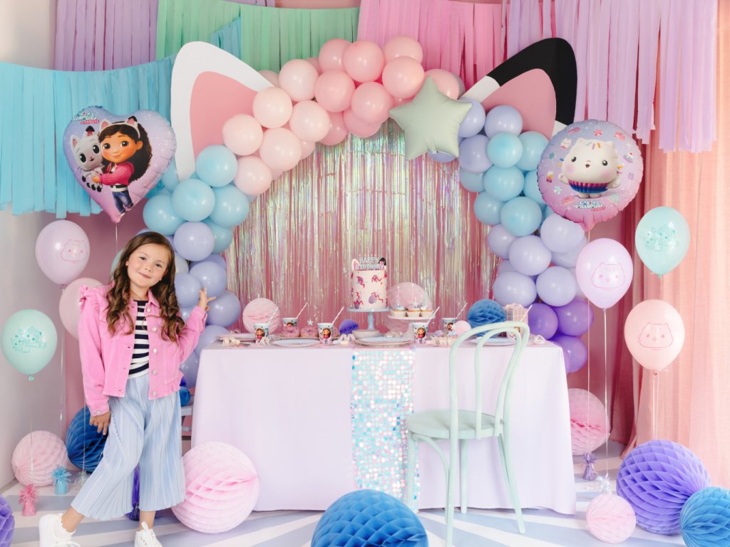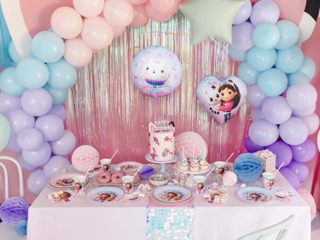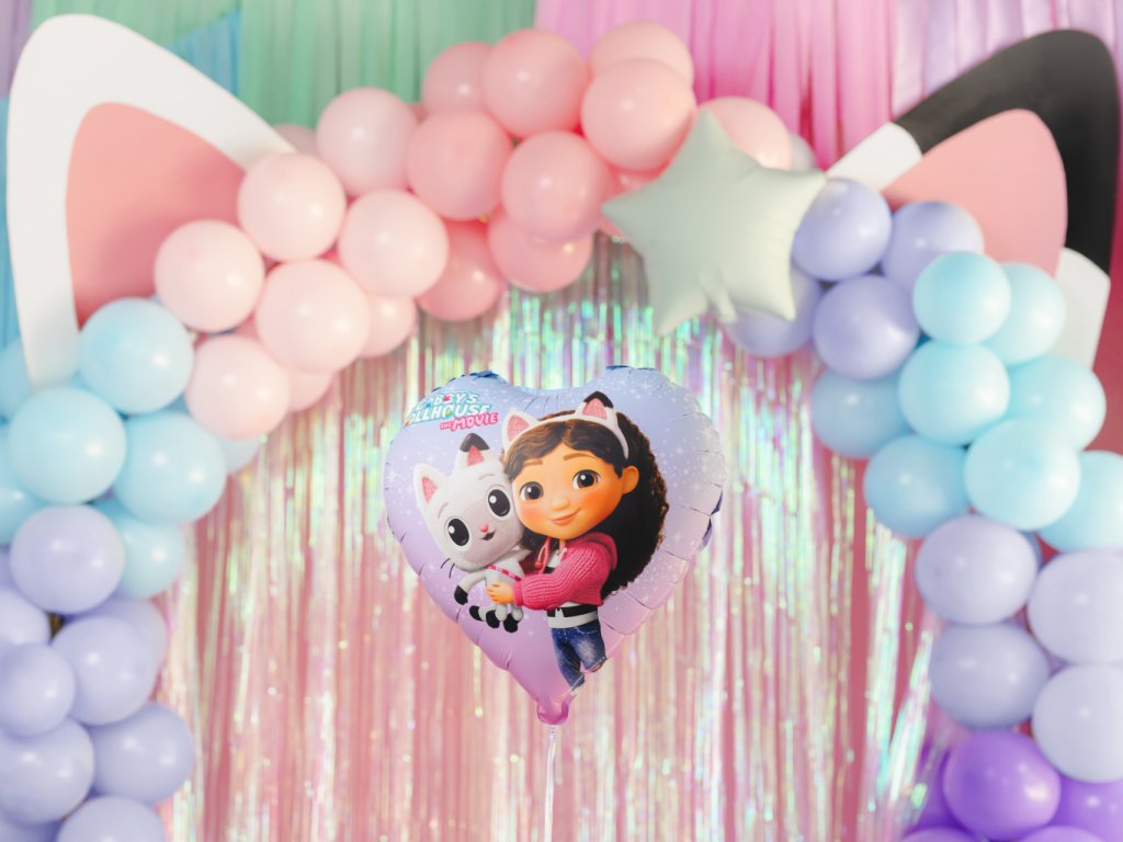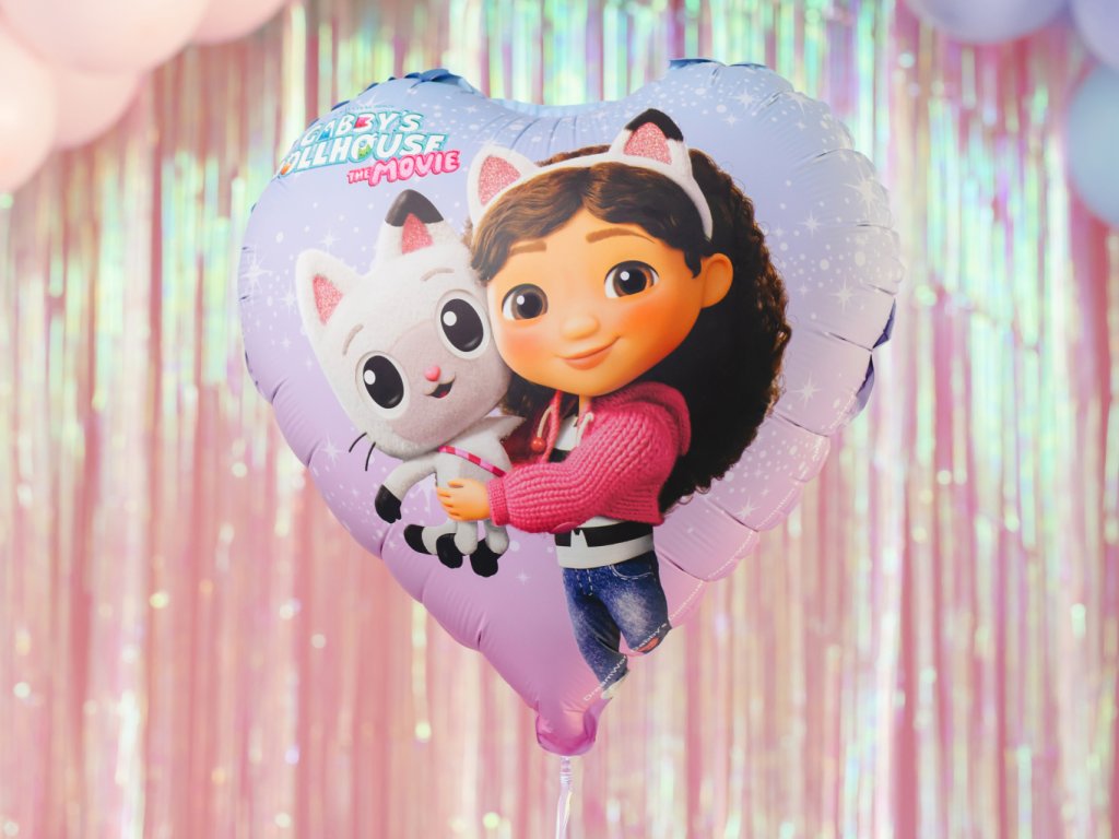 Fóliový balonek Gábinin kouzelný domek (Gabby's Dollhouse) ve tvaru srdce opatřený nahoře a dole očky pro zavěšení na stuhu nebo vlasec, velikost 45 cm.