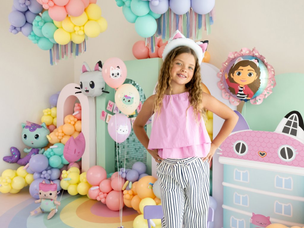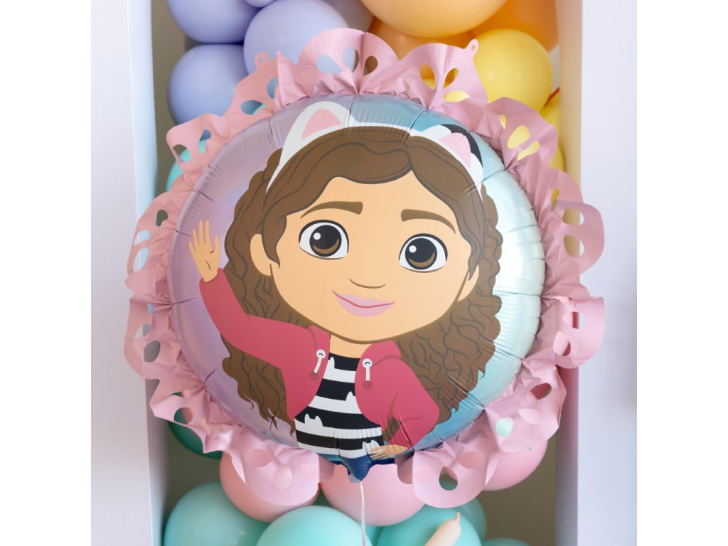 Fóliový balonek Gábinin kouzelný domek (Gabby's Dollhouse) ve tvaru kruhu s volánky opatřený nahoře a dole očky pro zavěšení na stuhu nebo vlasec, velikost 78 x 71 cm.