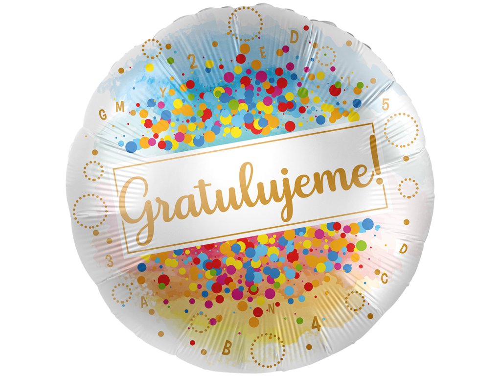Fóliový balonek bílý s barevným potiskem a nápisem Gratulujeme, velikost 43 cm.