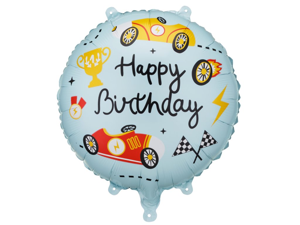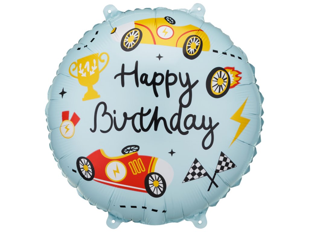 Fóliový balonek z kolekce Auto-závody ve světle modré barvě s potiskem a nápisem Happy Birthday, velikost 45 cm.
