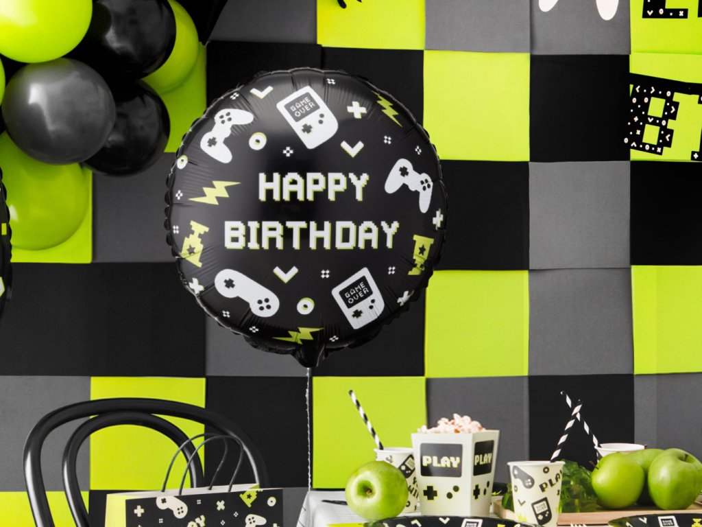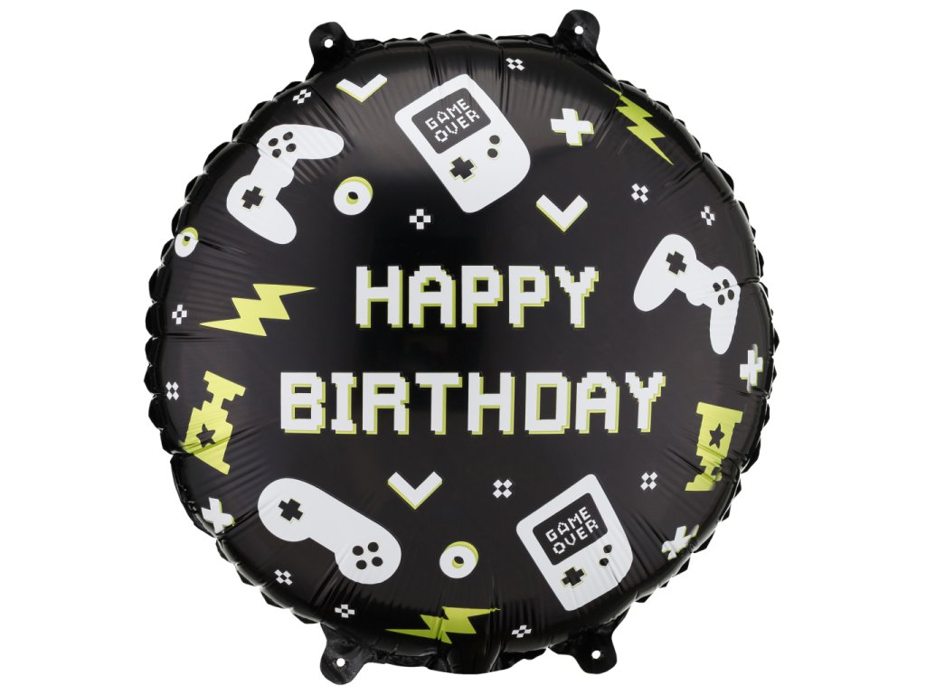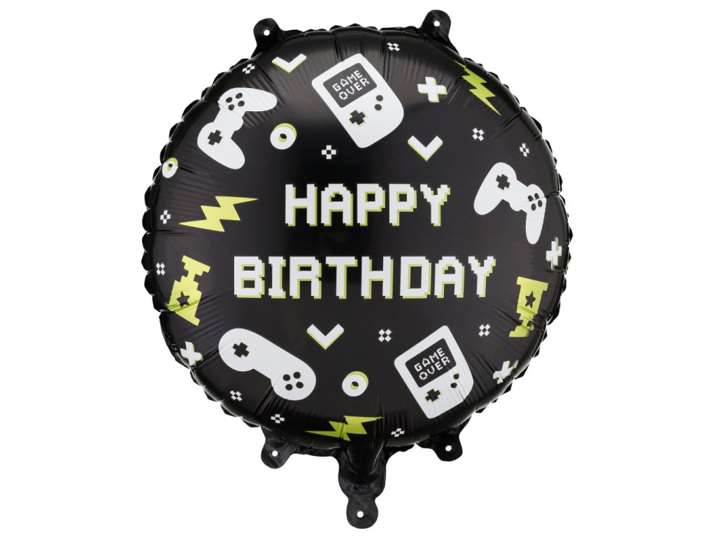 Fóliový balonek z kolekce Game v černé barvě s potiskem a nápisem Happy Birthday, velikost 45 cm.