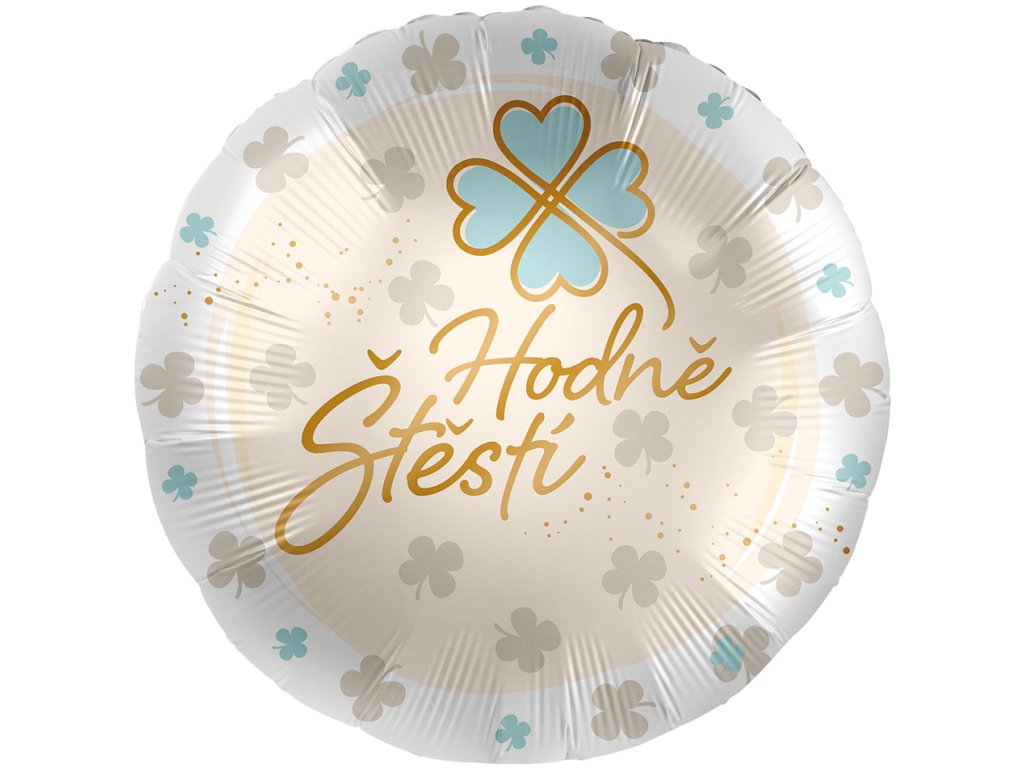 Fóliový balonek bílý se světlým potiskem, čtyřlístky a nápisem Hodně štěstí, velikost 43 cm.