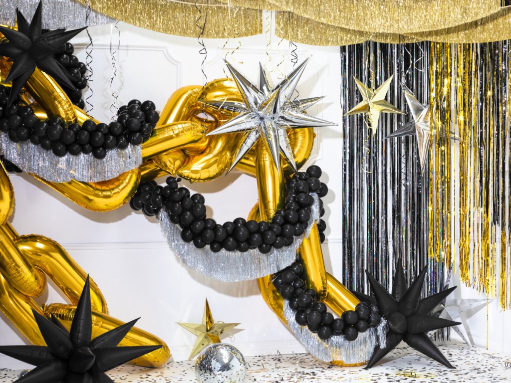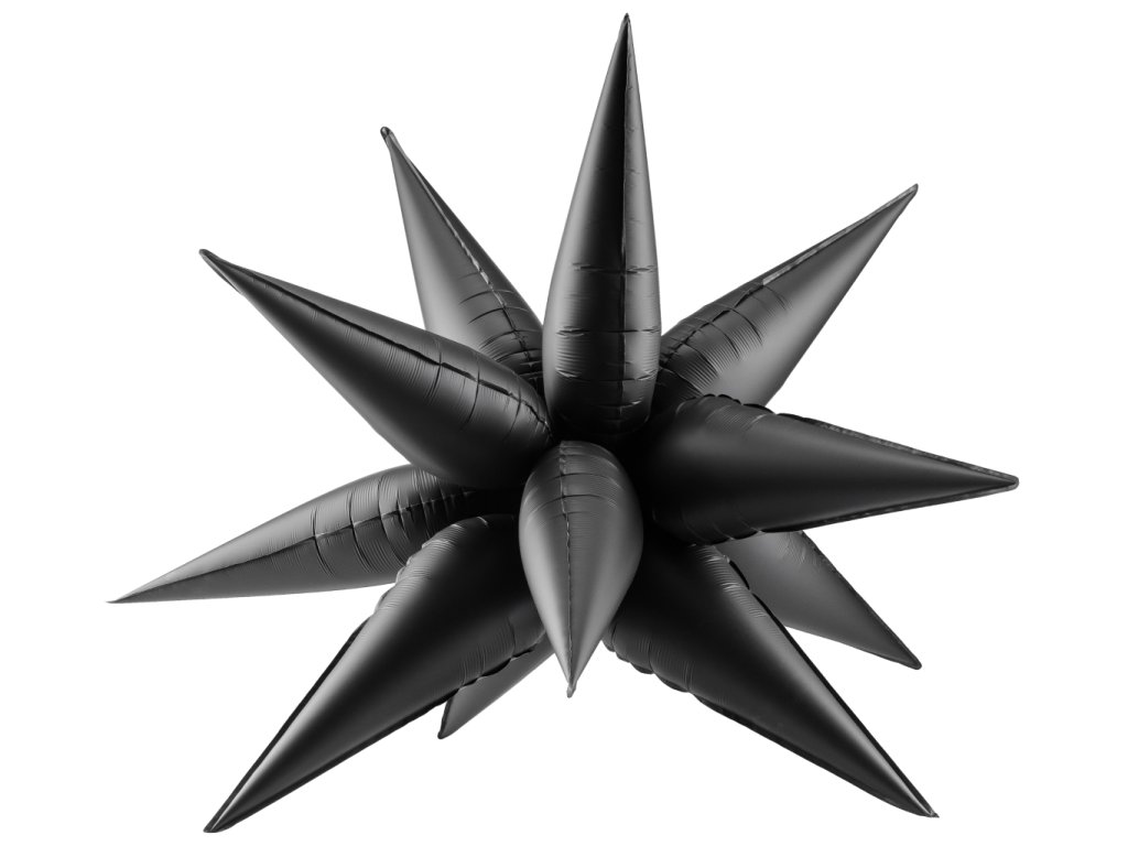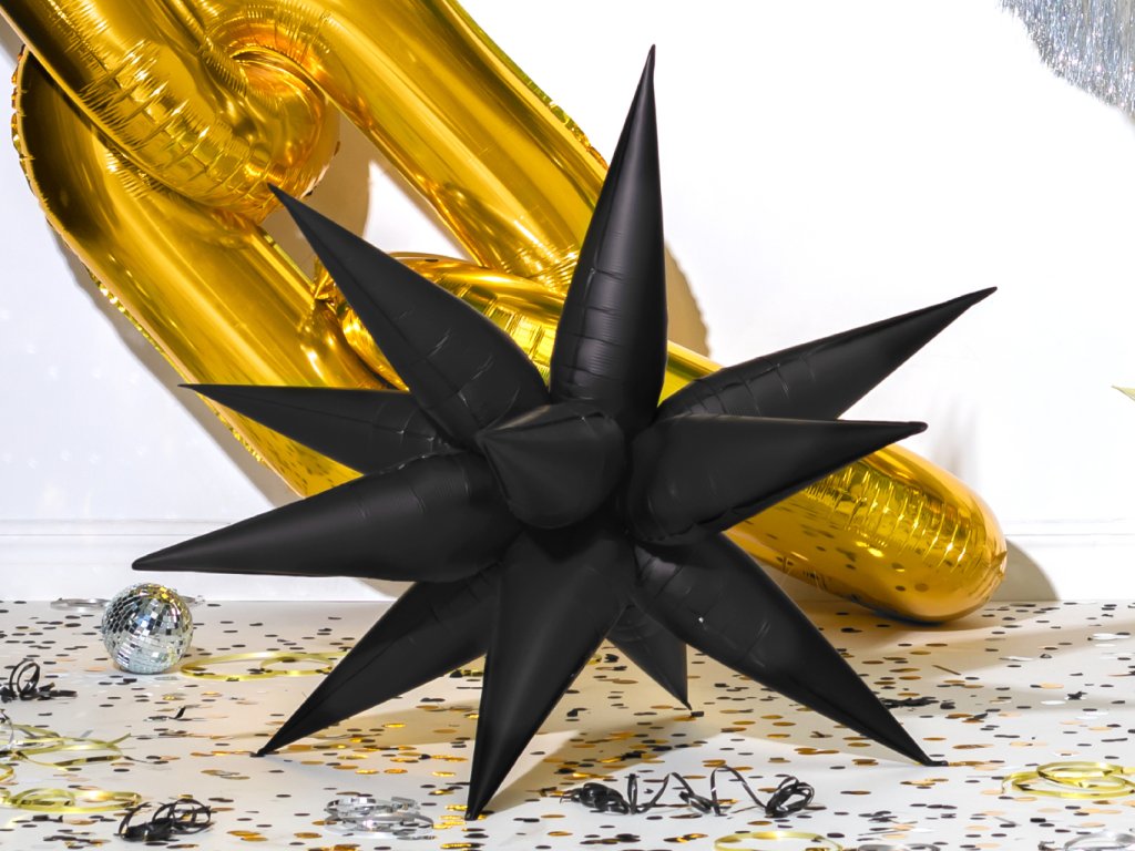 Dekorativní fóliový balonek ve tvaru 3D hvězdy, barva matná černá, velikost 95 cm. Balonek má několik částí, které je po nafouknutí potřeba "zaplést" do sebe dle návodu na zadní straně obalu.