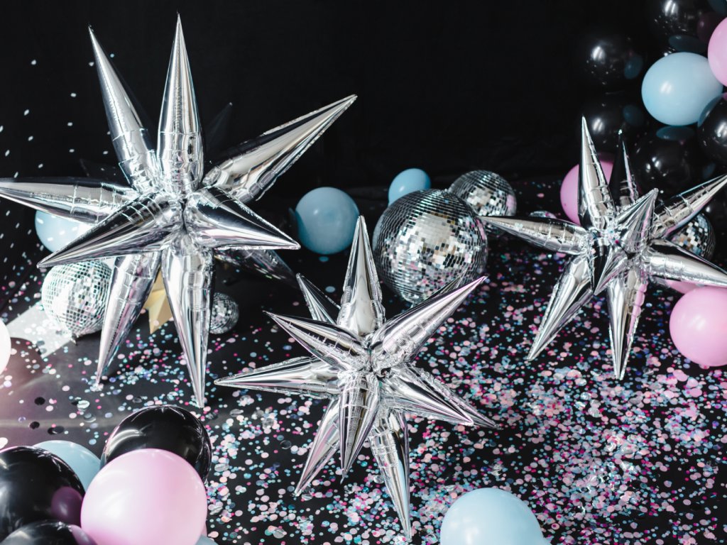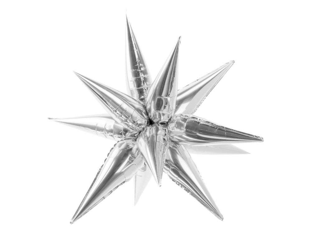 Dekorativní fóliový balonek ve tvaru 3D hvězdy, barva metalická stříbrná, velikost 70 cm. Balonek má několik částí, které je po nafouknutí potřeba "zaplést" do sebe dle návodu na zadní straně obalu.