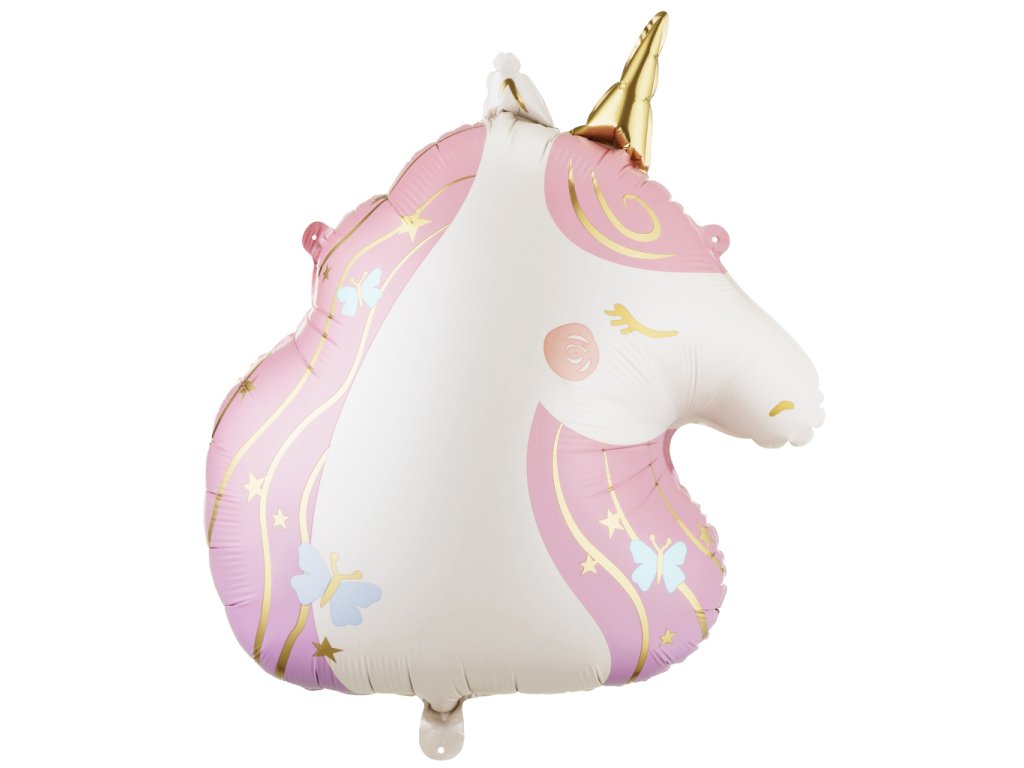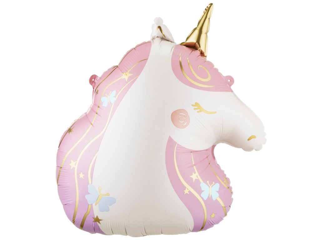 Fóliový balonek Jednorožec (Unicorn) ve smetanové a světle růžové barvě se zlatými prvky, velikost 66 x 78 cm.