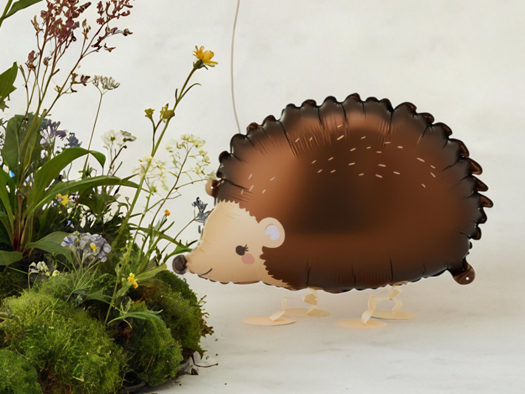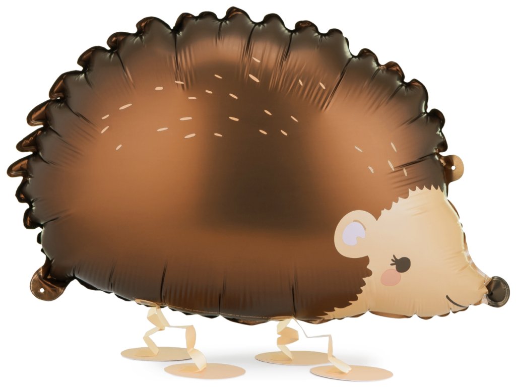 CHODÍCÍ fóliový balonek Ježek v tmavě hnědé barvě s potiskem, velikost 65,5 x 47 cm, výška nohou cca 10 cm.