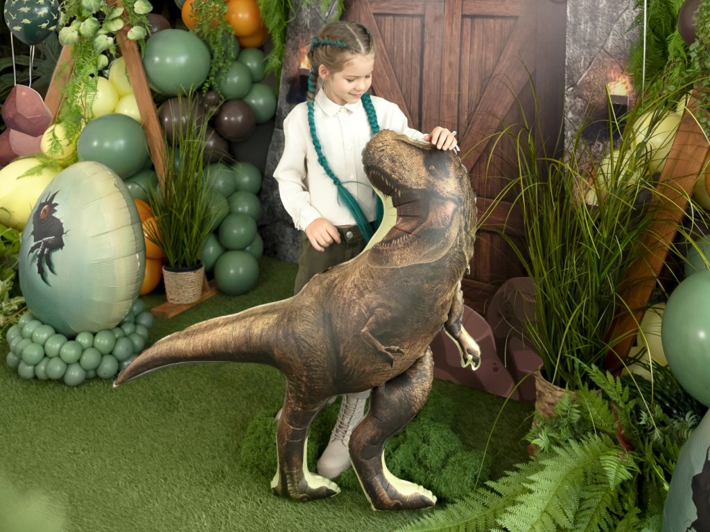 Přiveďte na svou oslavu skutečného krále pravěku! Tento obří tvarovaný fóliový balonek v podobě kráčejícího Tyrannosaura Rexe je naprostou senzací pro každého malého paleontologa. Díky svému realistickému provedení, detailní textuře šupinaté kůže a dravému postoji s otevřenou tlamou okamžitě promění váš domov v divoký Jurský svět.
