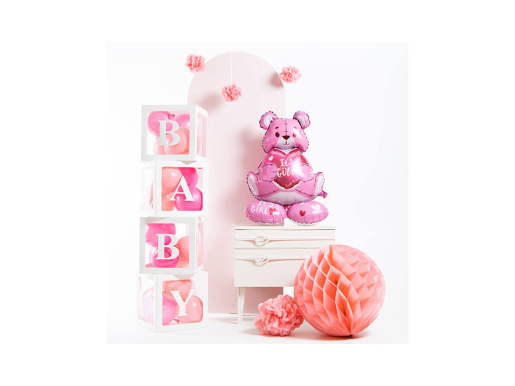 STOJÍCÍ fóliový balonek Medvěd v růžové barvě se základnou a nápisem It's a Girl, velikost 61 cm.