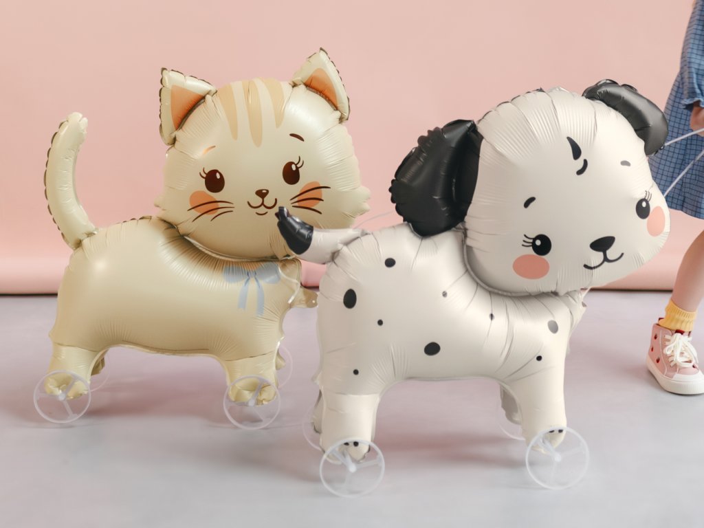 JEZDÍCÍ fóliový balonek Pejsek na kolečkách v béžové barvě s černým potiskem, velikost 85 x 75 cm. Balení obsahuje balonek, kolečka, stuhu a brčko k nafouknutí.