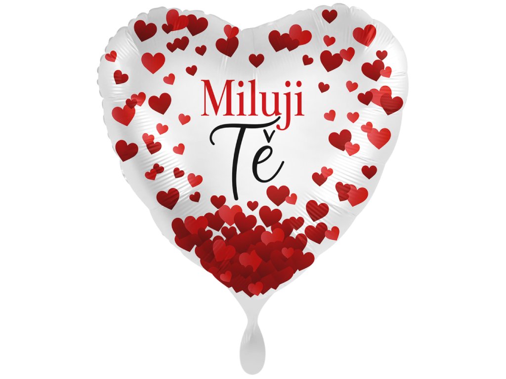 Fóliový balonek srdce bílé s červenými srdíčky a nápisem Miluji Tě, velikost 43 cm.