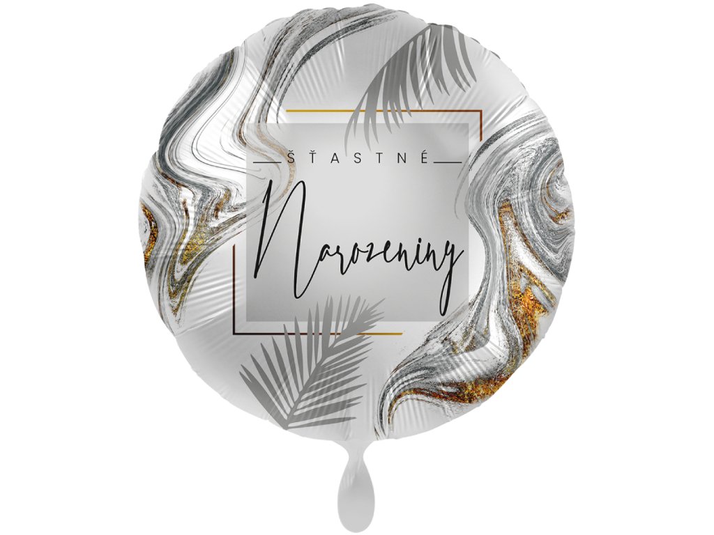Fóliový balonek bílý se stříbrným potiskem a nápisem Šťastné narozeniny, velikost 43 cm.