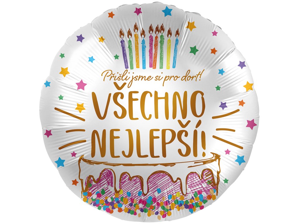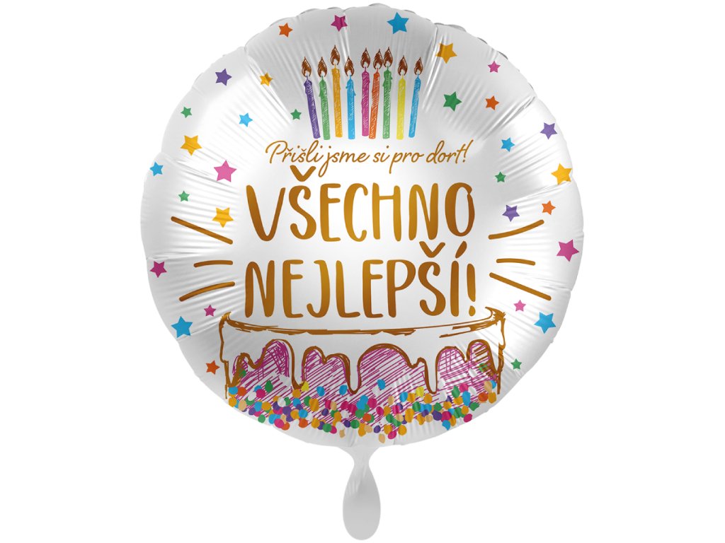 Fóliový balonek bílý s barevným potiskem, dortem se svíčkami a nápisem Přišli jsme si pro dort! Všechno nejlepší, velikost 43 cm.