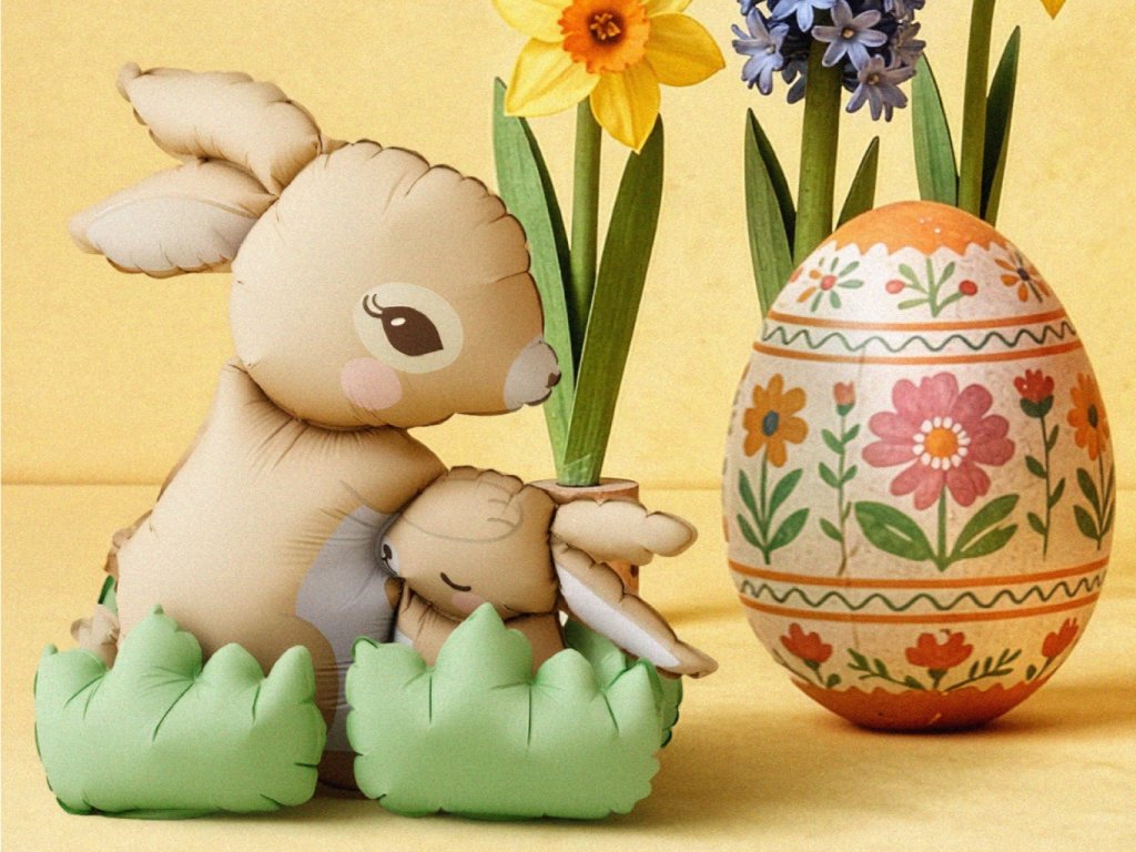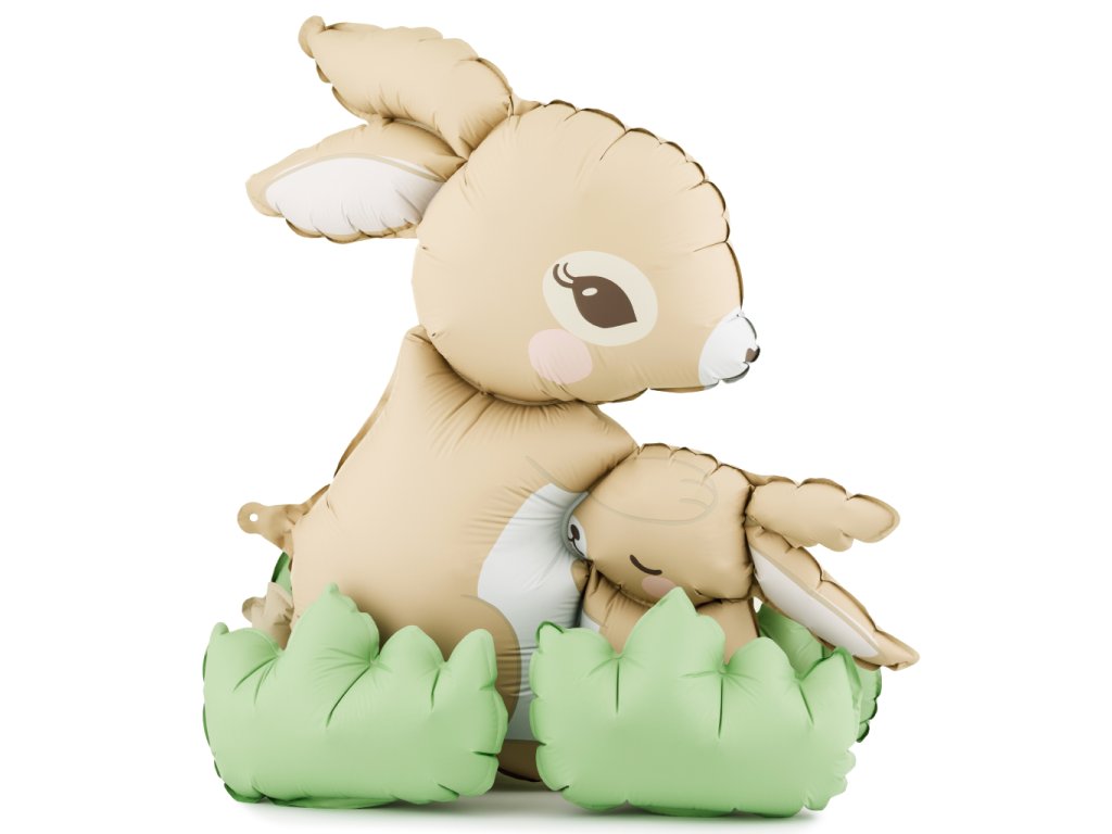 STOJÍCÍ fóliový balonek Zajíci v béžové barvě sedící v zelené trávě, velikost 74,5 x 71 cm.