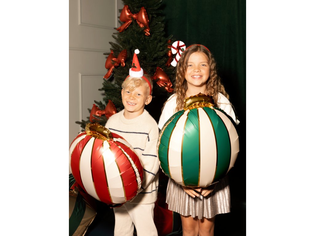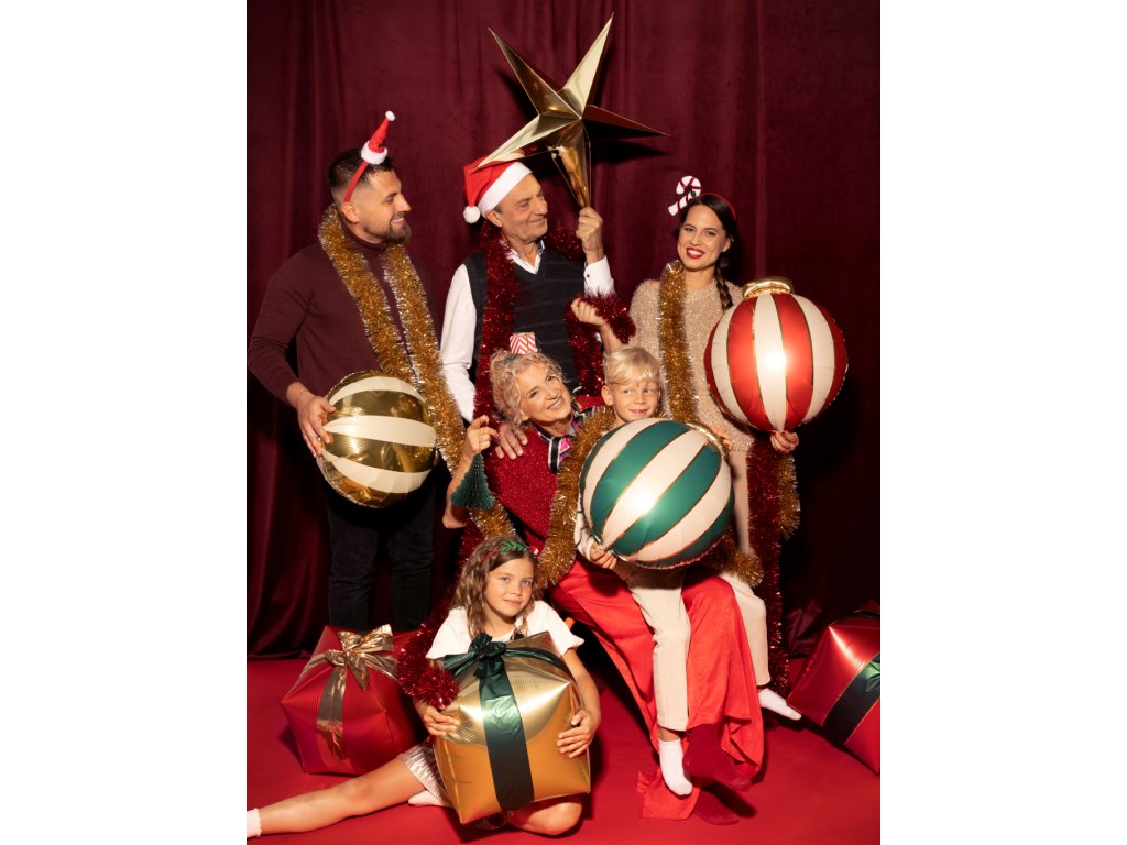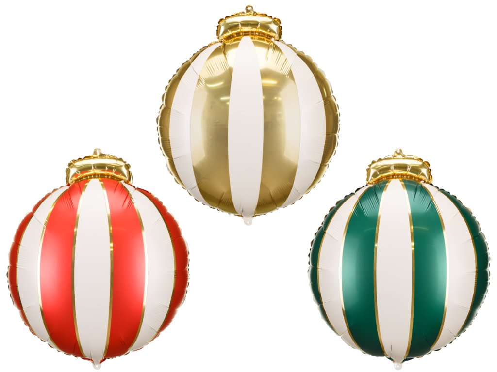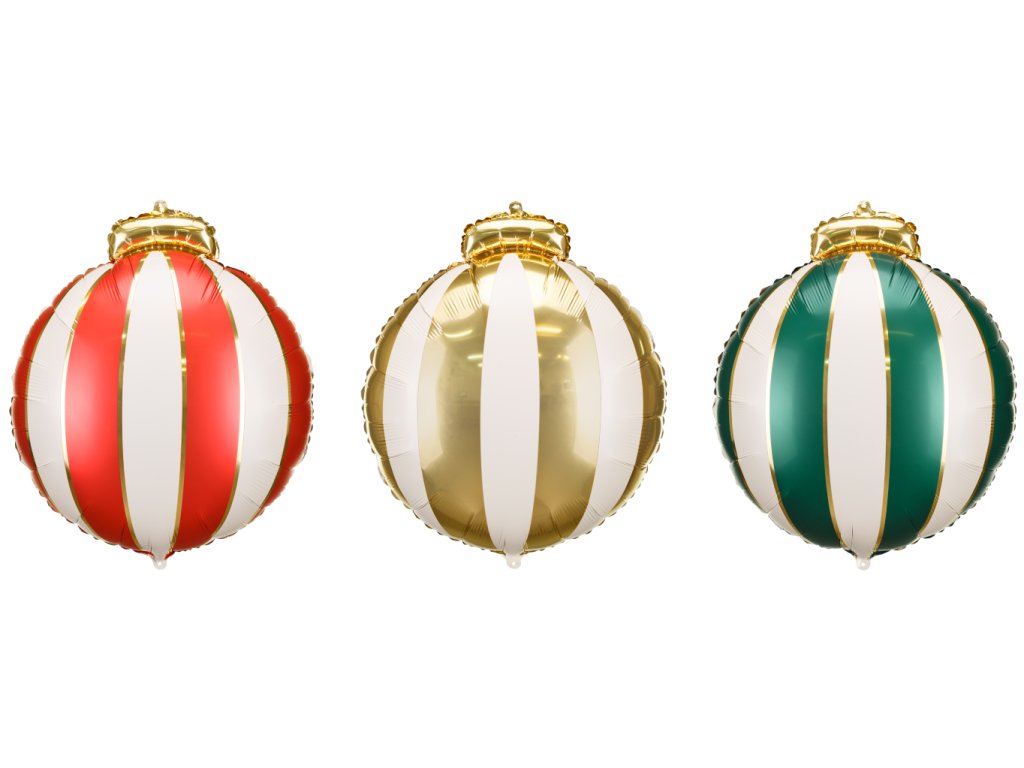 Fóliové balonky Vánoční koule ve tvaru kruhu s červeným, zeleným a zlatým potiskem, velikost jednoho balonku 54 x 60 cm.