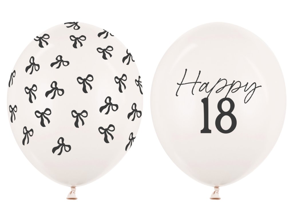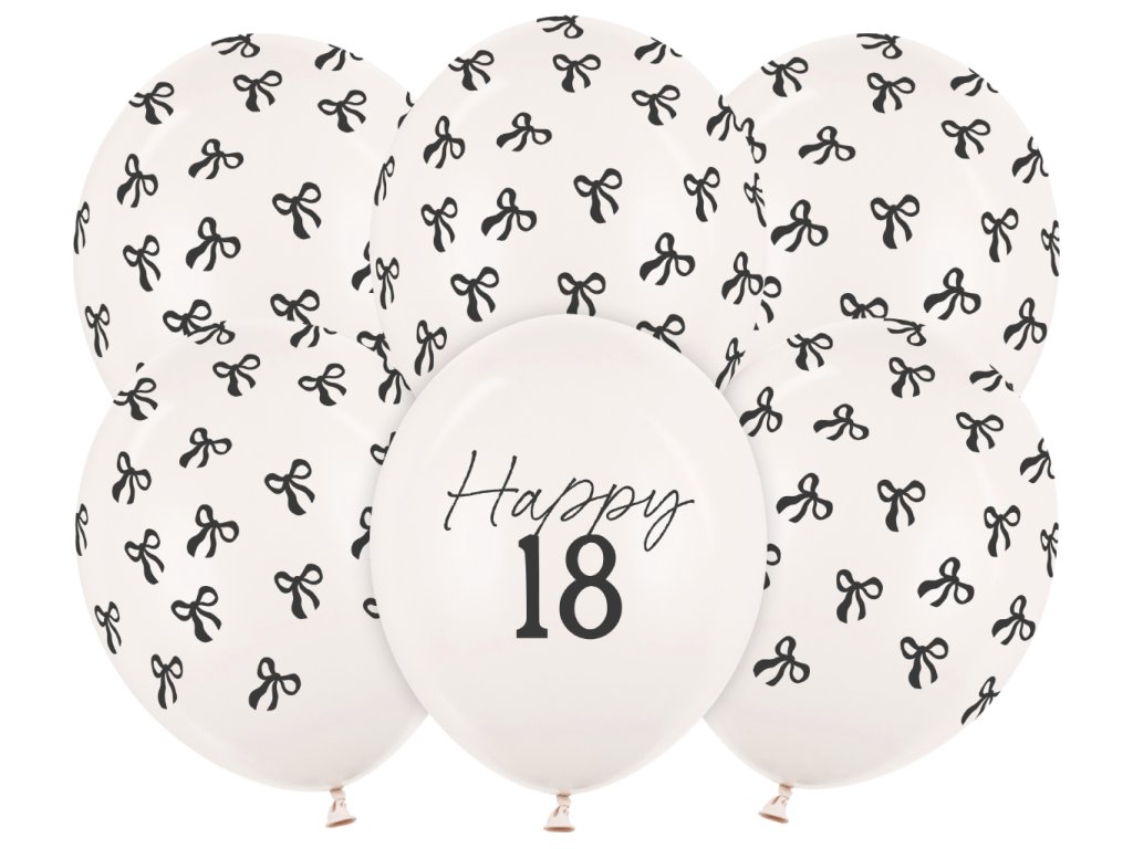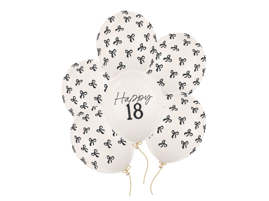 Set latexových balonků s číslem 18 a mašličkami v krémově bílé barvě s černým potiskem, velikost 30 cm, v balení 6 ks.