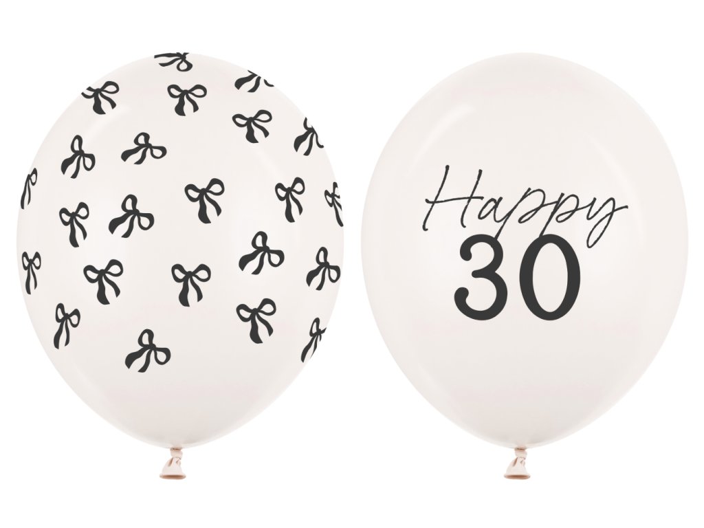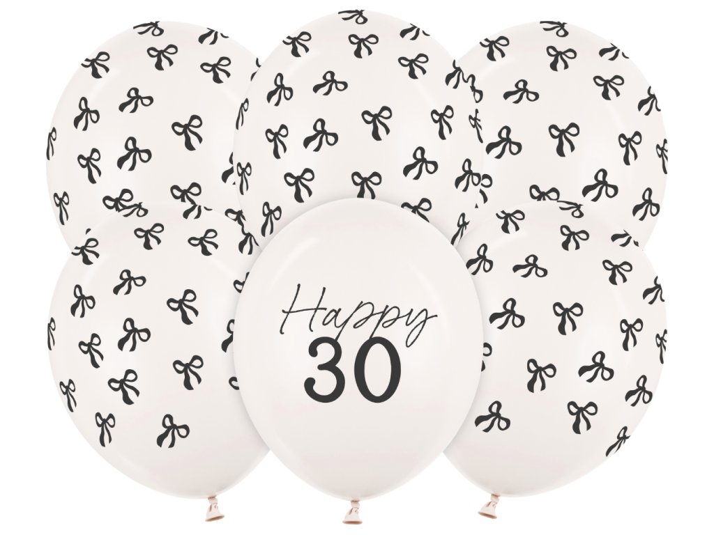 Set latexových balonků s číslem 30 a mašličkami v krémově bílé barvě s černým potiskem, velikost 30 cm, v balení 6 ks.