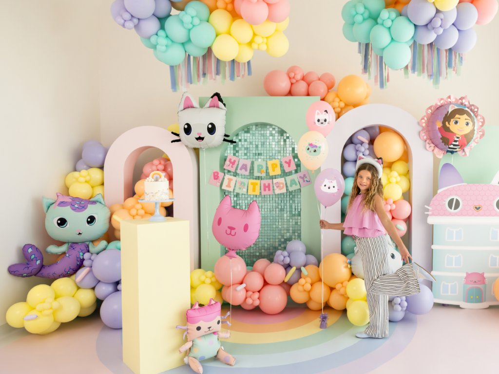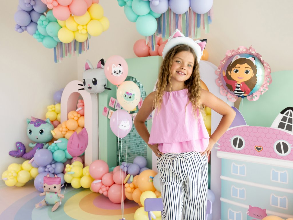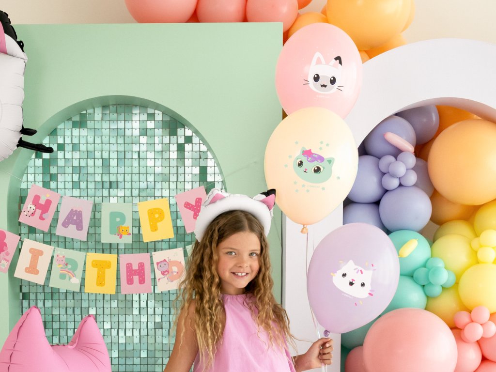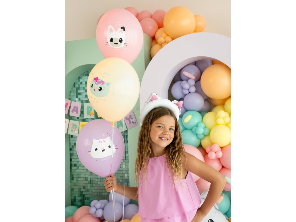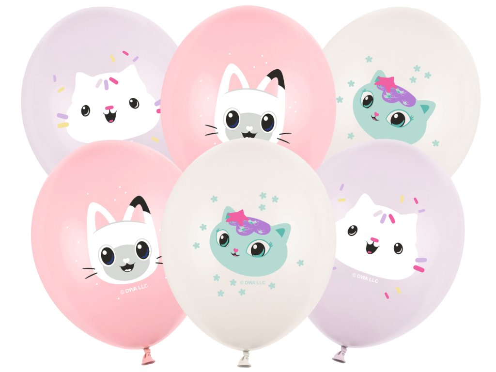 Set latexových balonků s postavičkami Dortě (Cakey), Pandy Ťapka (Pandy Paws) a Rybočka (MerCat) ze seriálu Gábinin kouzelný domek (Gabby's Dollhouse), velikost 30 cm, v balení 6 ks dle obrázku (2 ks pastelový bledě fialový, 2 ks pastelový světle růžový, 2 ks pastelový bledě žlutý).