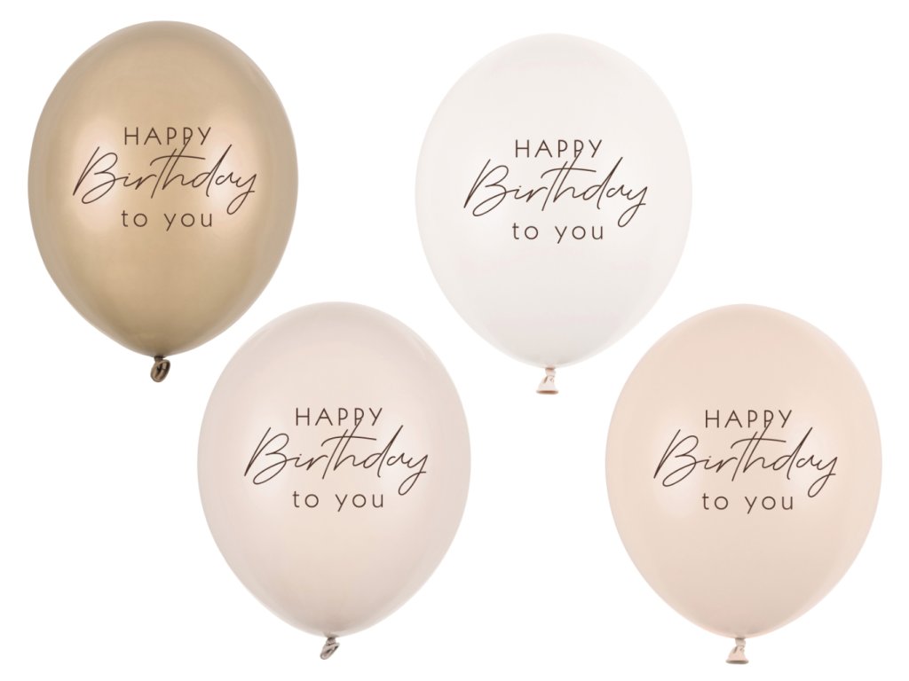 Set latexových balonků Happy Birthday To You v barvách pastelová světle šedá, metalická matně zlatá, pastelová krémově bílá a pastelová béžová s dvoustranným potiskem, velikost 30 cm, v balení 6 ks.