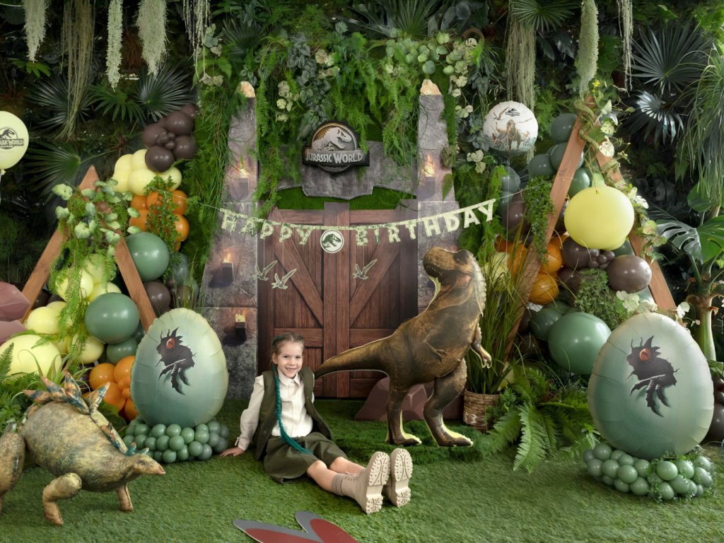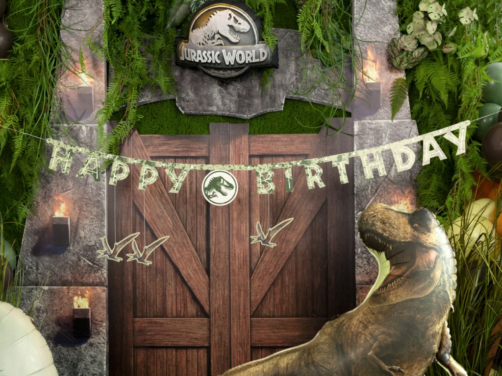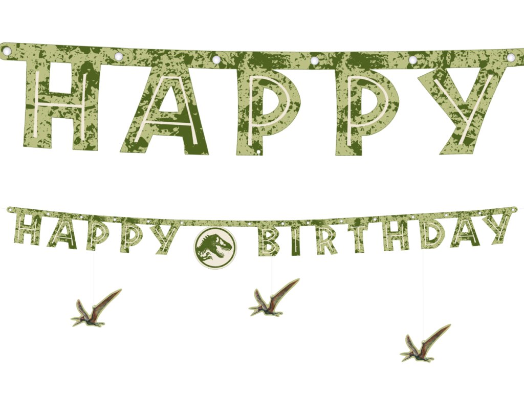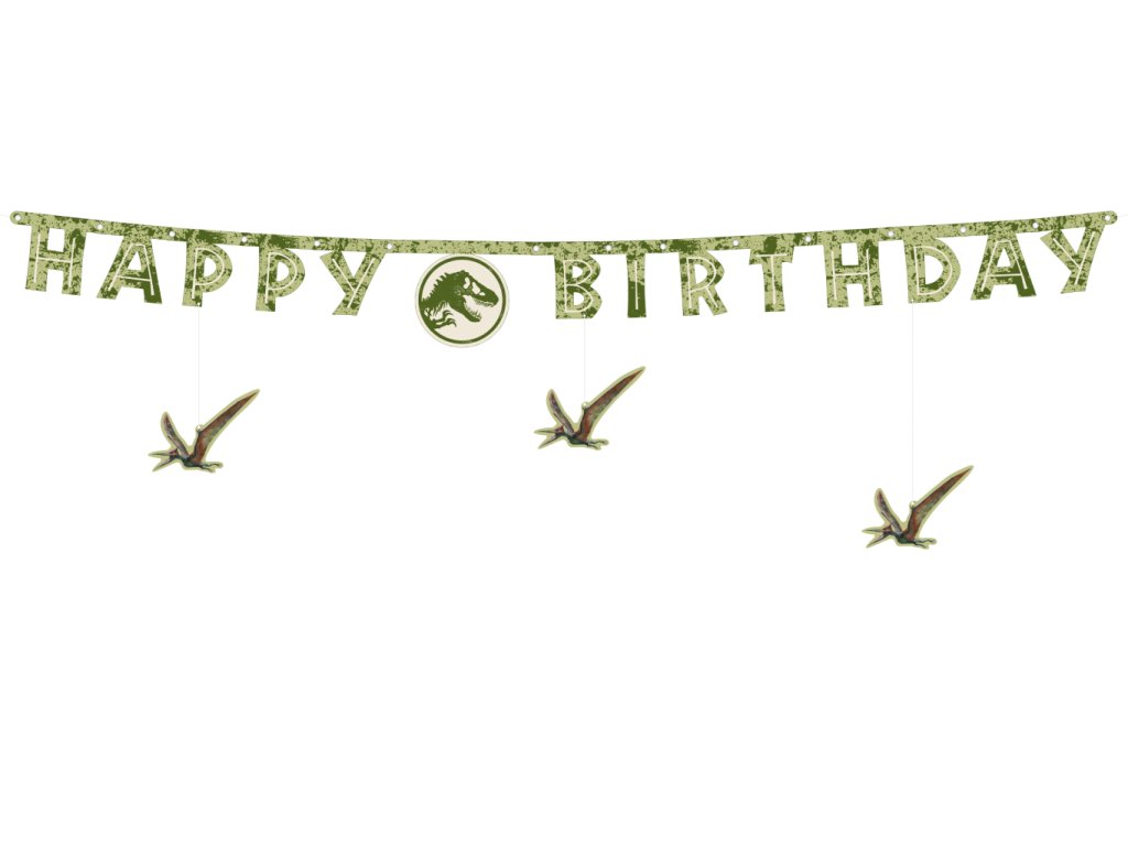 Oznamte velkolepou oslavu stylově a s pořádnou dávkou dobrodružství! Tento originální narozeninový banner s nápisem „Happy Birthday“ zaujme svým unikátním maskáčovým vzorem v odstínech zelené a hnědé, který dokonale splývá s divokou přírodou. Dominantou je kulatý znak s ikonickým logem T-Rexe, ale to nejlepší jsou tři visící Pteranodoni, kteří se pod nápisem vznášejí, jako by právě kroužili nad vaším párty stolem.