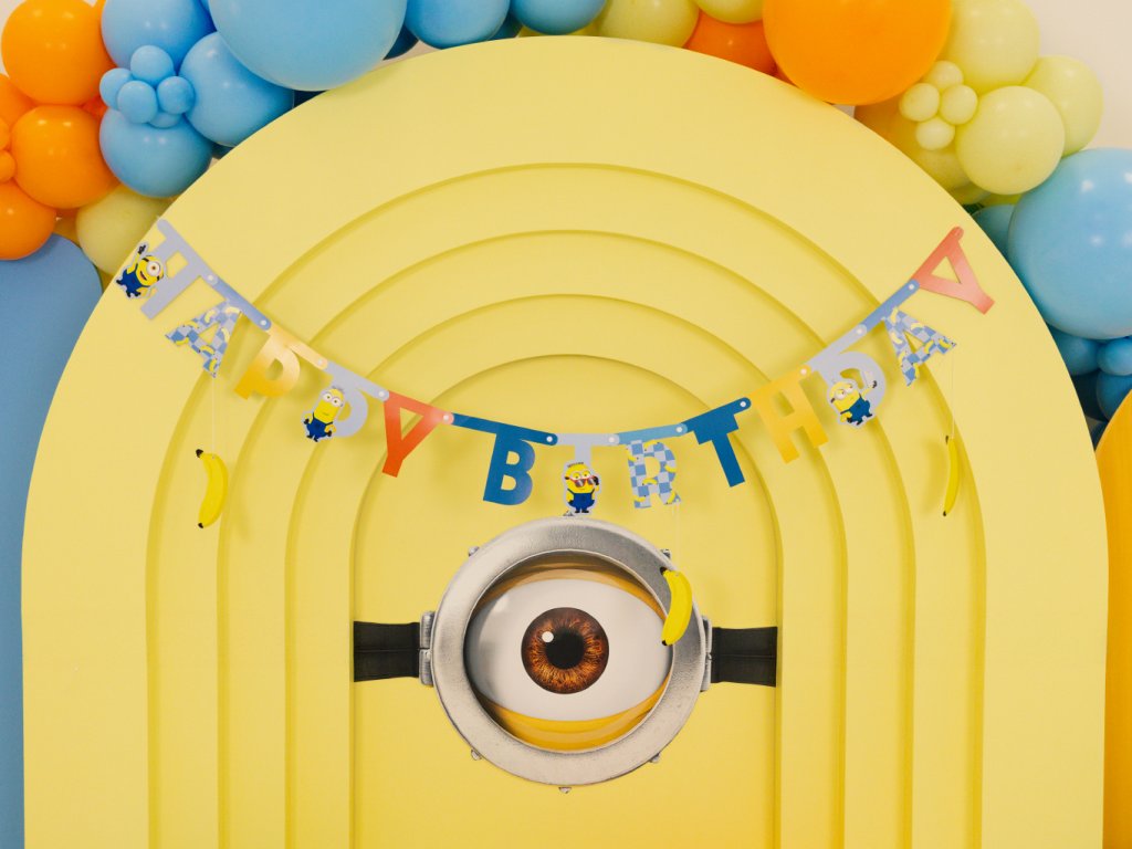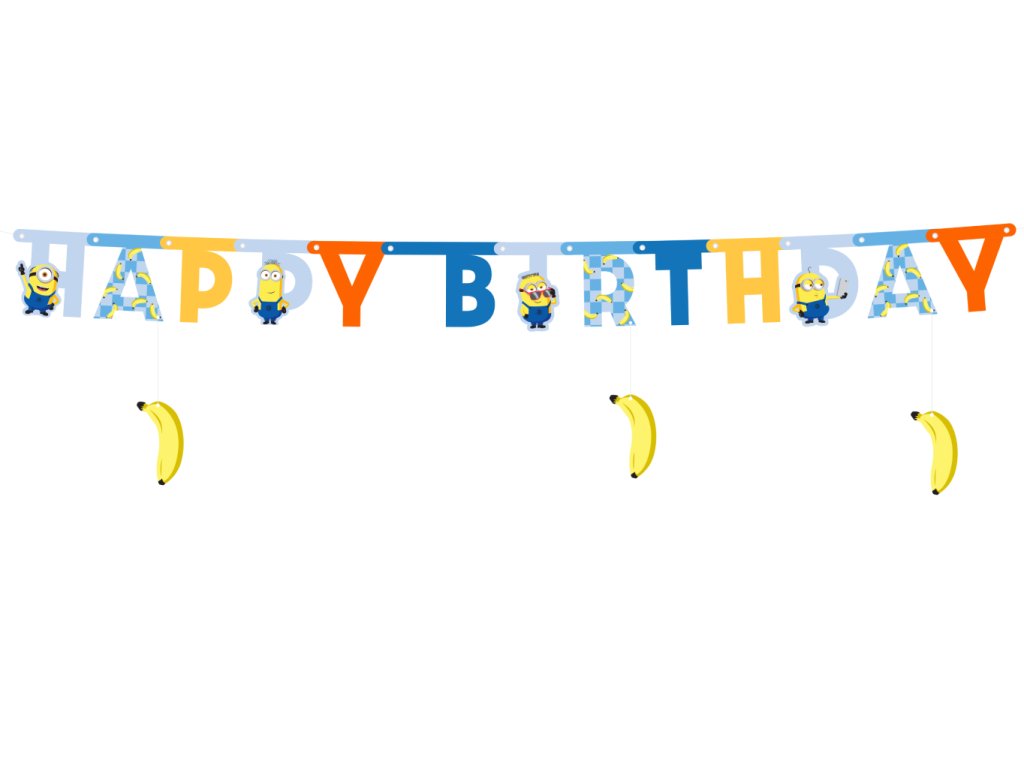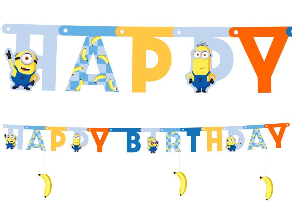 Tento banner je přesně tím detailem, který promění obyčejný pokoj v opravdové mimoňské doupě! Díky své délce a pestrým barvám se stane nepřehlédnutelnou dominantou každé oslavy. Oznamte světu, že se slaví ve velkém stylu! Tento originální narozeninový banner kombinuje klasický nápis „Happy Birthday“ s hravými postavičkami Mimoňů a – jak jinak – jejich milovanými banány, které z nápisu vesele visí. Písmena jsou laděna do modrých, žlutých a oranžových odstínů s jemnými vzory, což dodává dekoraci moderní a dynamický vzhled.