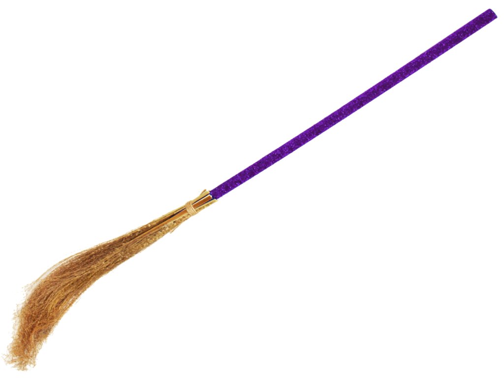 Čarodějnické koště ve fialové barvě tvoří plastová rukojeť a roští, rozměr koštěte se pohybuje v rozmezí 80 - 90 cm.