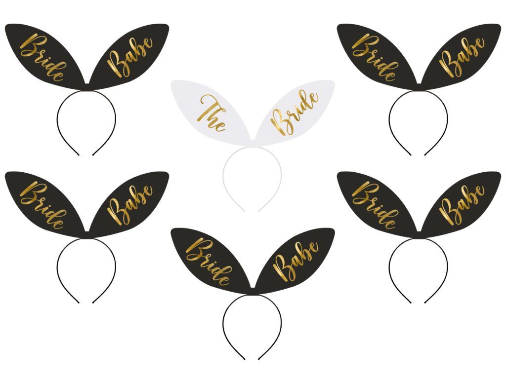 Čelenky s králičími oušky na rozlučku se svobodou, sada obsahuje 6 ks - 1x bílou čelenku se zlatým nápisem The Bride (nevěsta) a 5x černou čelenku se zlatým nápisem Bride Babes (nevěstiny holky), velikost 29 x 25 cm.