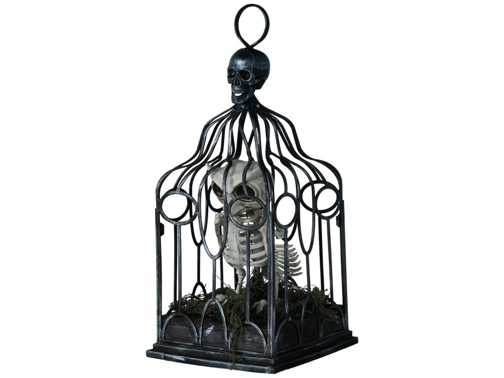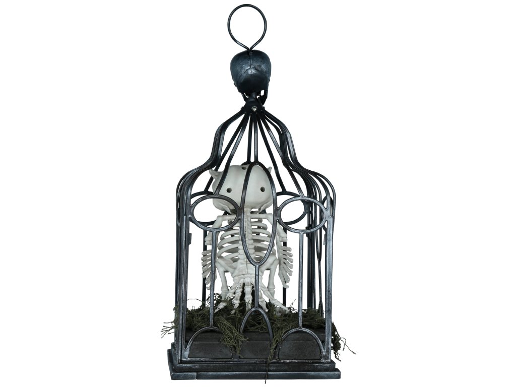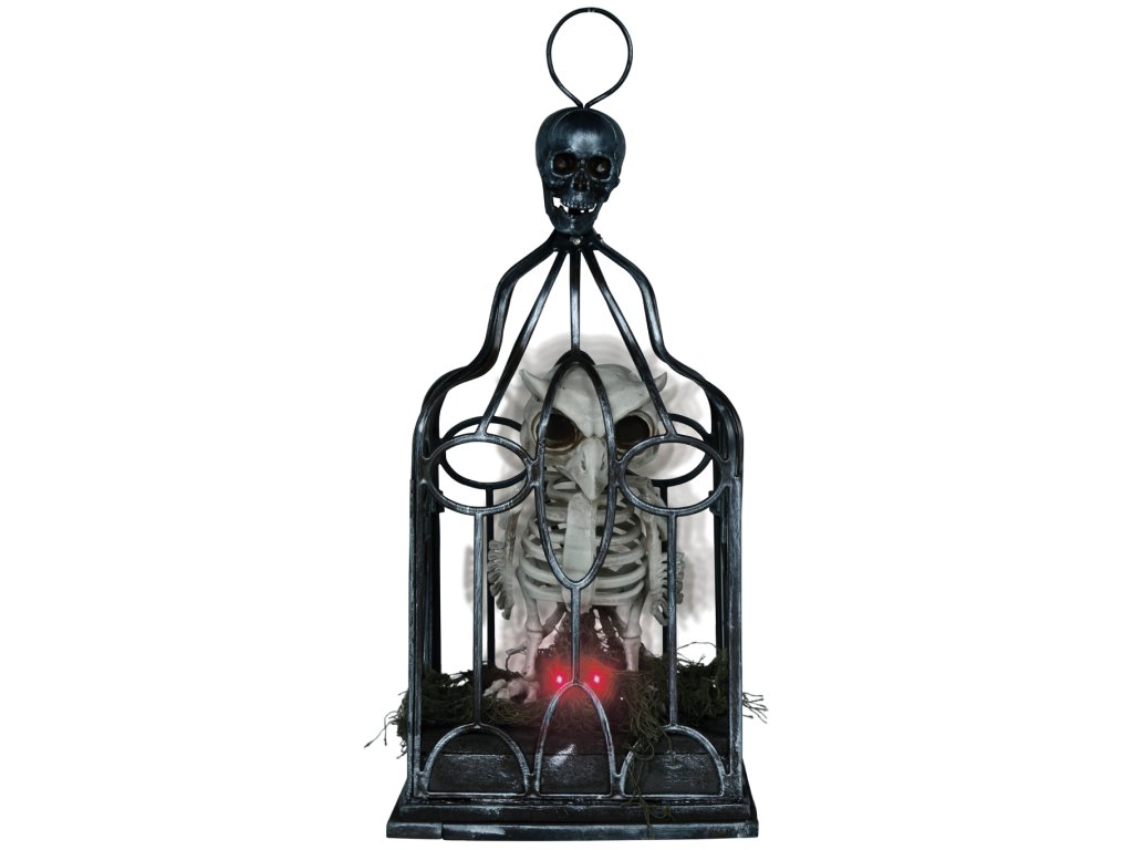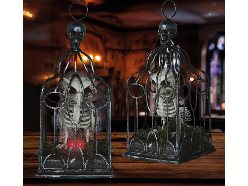 Halloweenská dekorace Kostra sovy v kleci, která se pohybuje, vydává zvuky a svítí. Materiál kov/plast, celková velikost dekorace 33 cm.