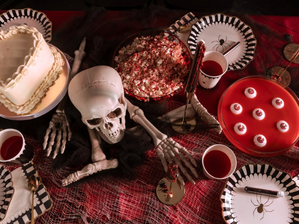 Halloweenská dekorace Kostra určená pro vnitřní i venkovní použití se skládá z 5 částí - lebka, 2 ruce, 2 nohy.