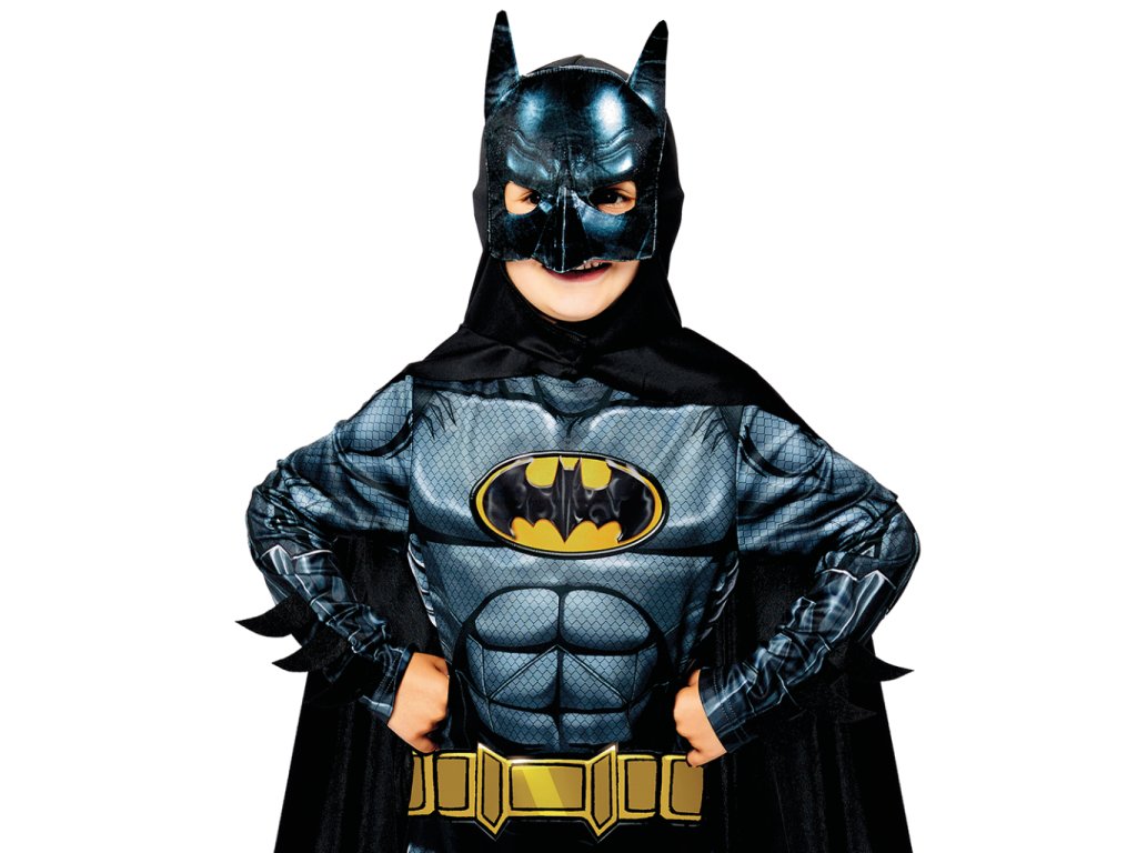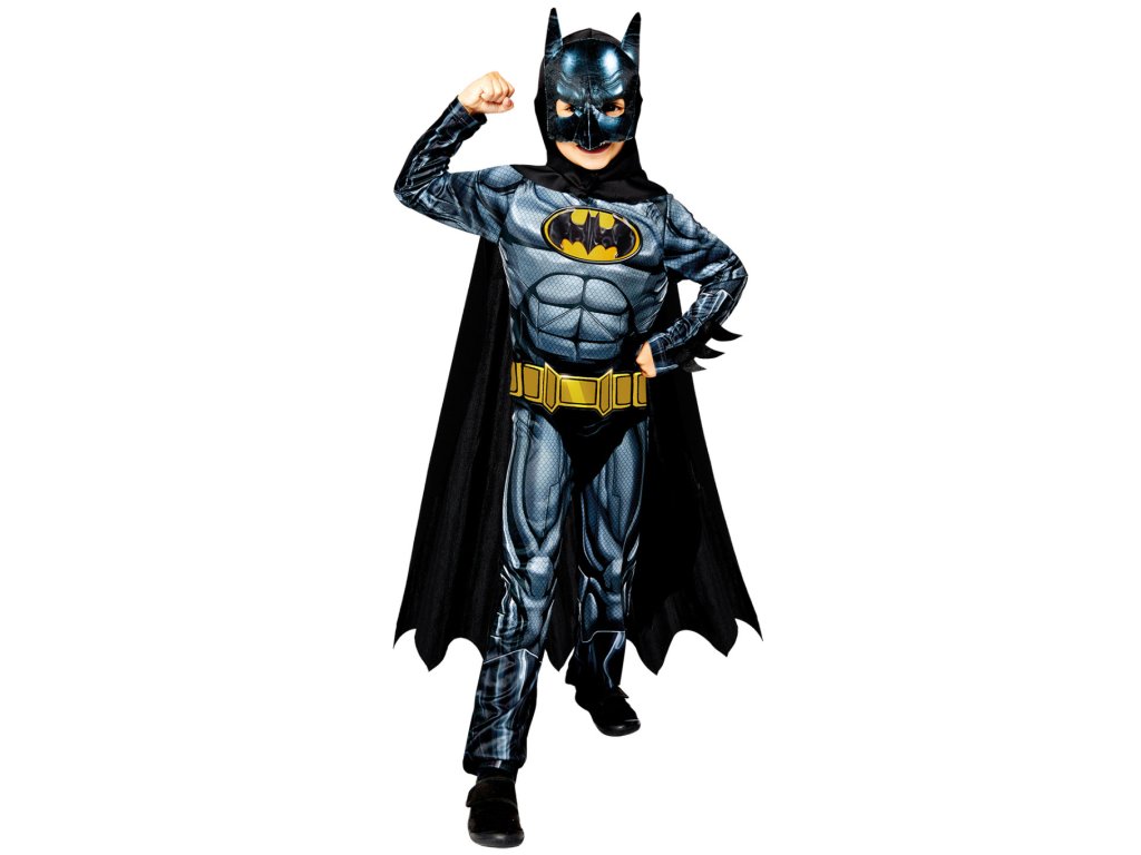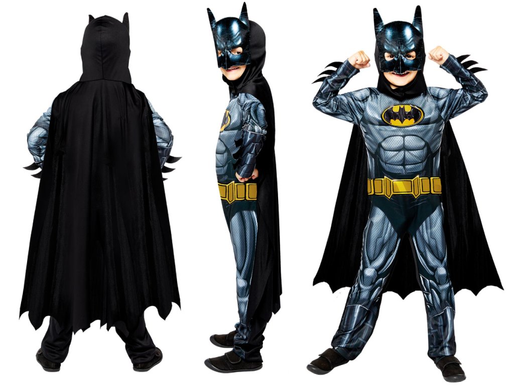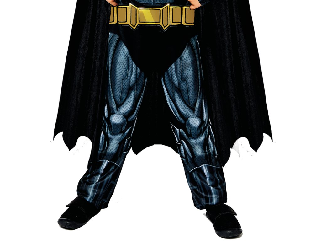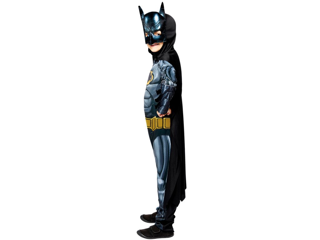 Dětský kostým Batman v šedo-černé barvě tvoří maska na obličej s připevněným pláštěm a overal s potiskem a 3D detaily na manžetách, velikost 140-152 cm (10-12 let). Balení obsahuje overal a masku s pláštěm.