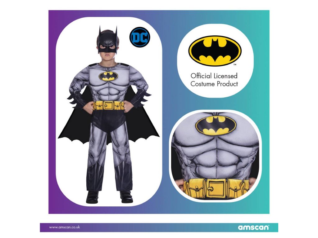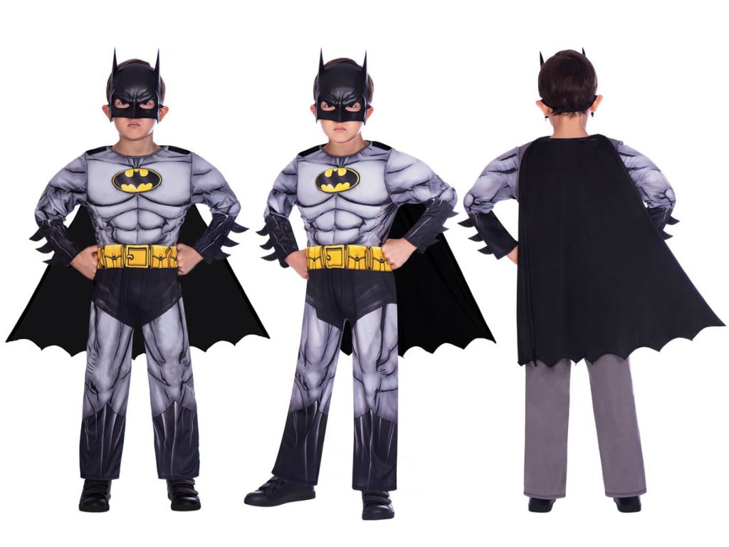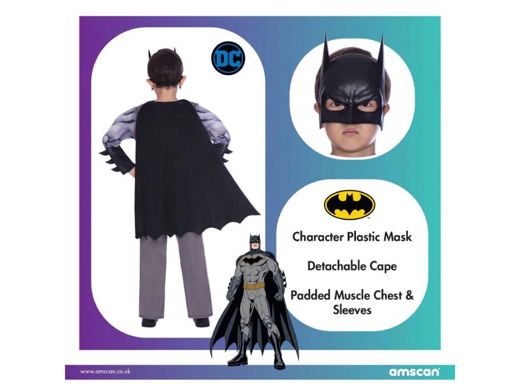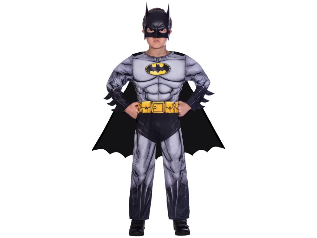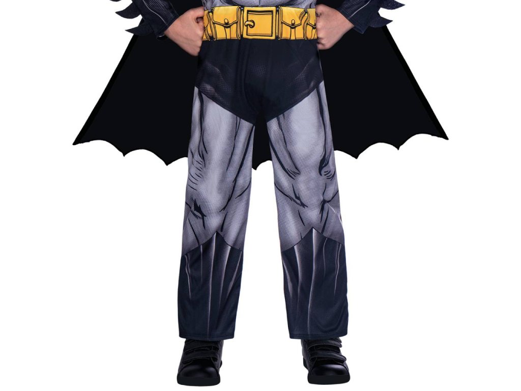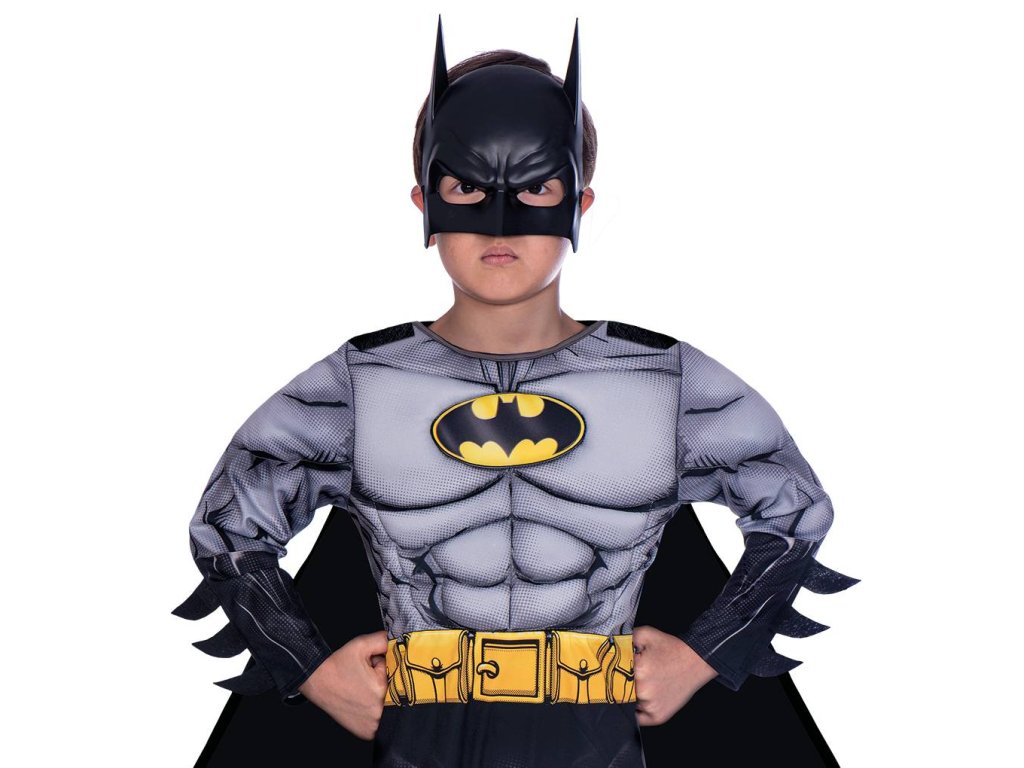 Dětský kostým Batman v šedočerné barvě tvoří plastová maska na obličej a pružný overal s vyztuženým hrudníkem a rukávy, který má 3D detaily na manžetách a odnímatelnou pláštěnku, velikost 140-152 cm (10-12 let). Balení obsahuje overal s pláštěnkou a masku.