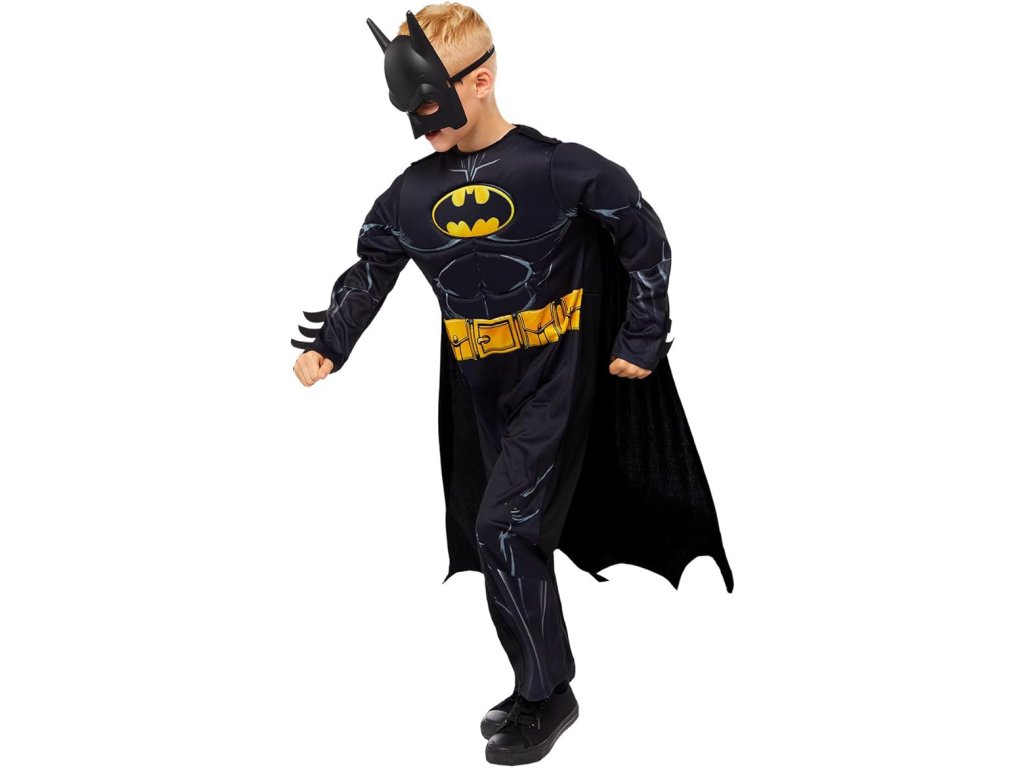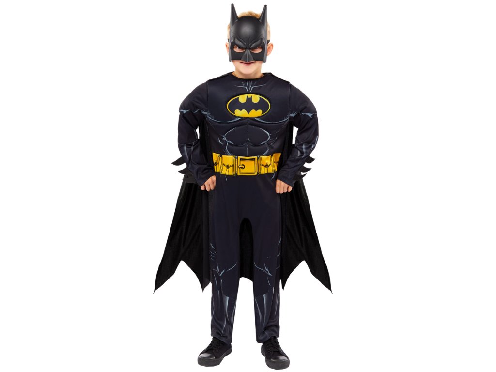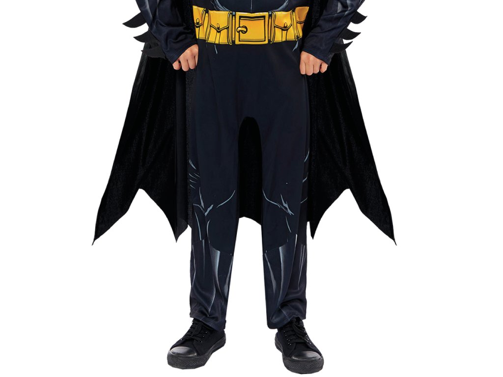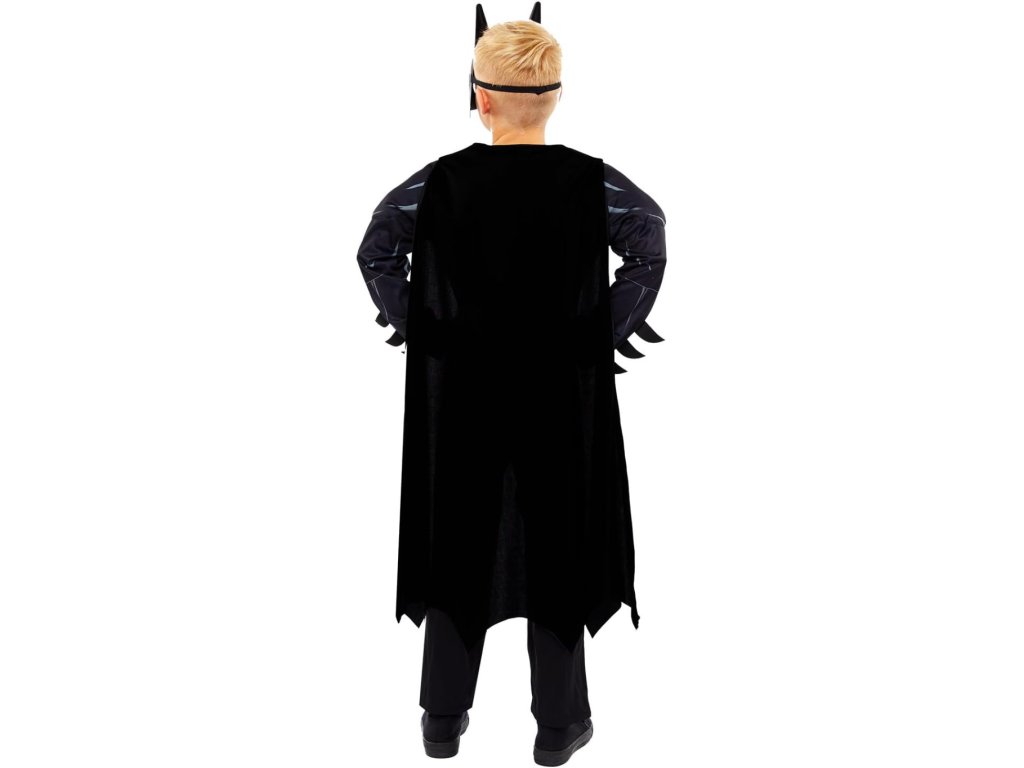 Dětský kostým Batman v černé barvě tvoří plastová maska na obličej a pružný overal, který má vyztužený hrudník a rukávy, 3D detaily na manžetách a černou pláštěnku, velikost 116-128 cm (6-8 let). Balení obsahuje overal s pláštěnkou a masku.