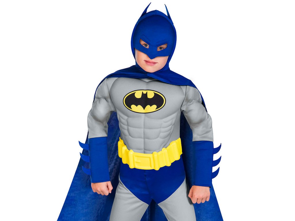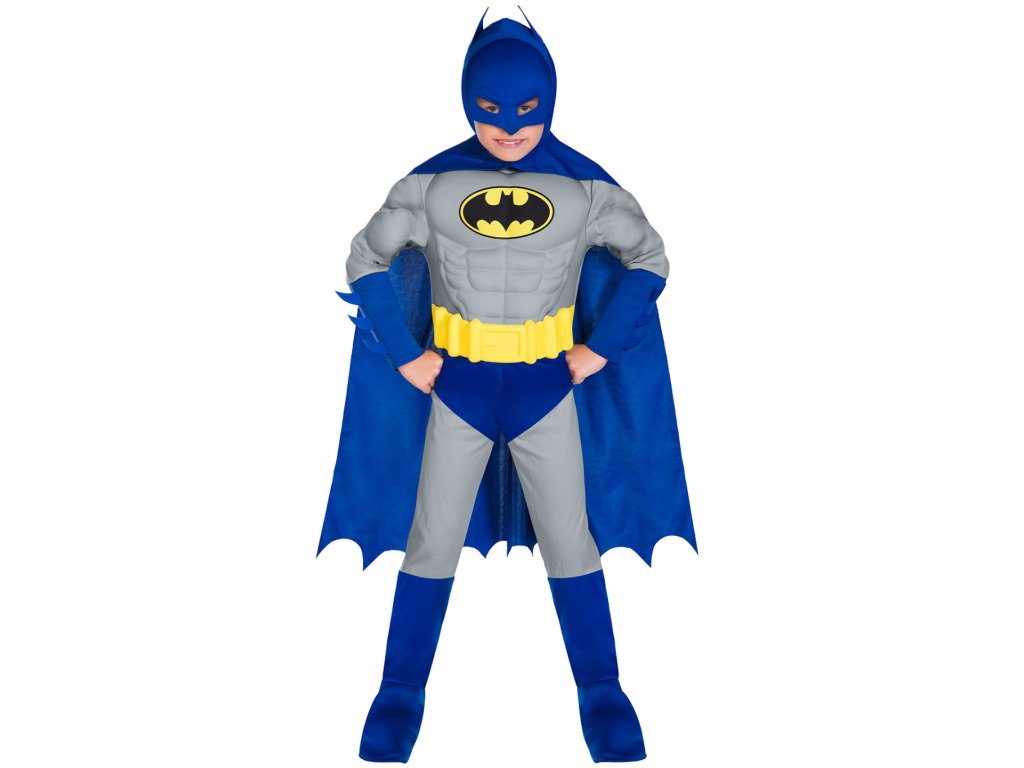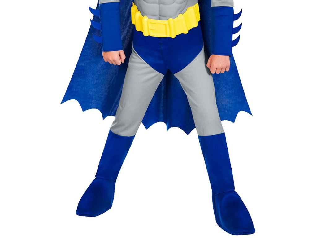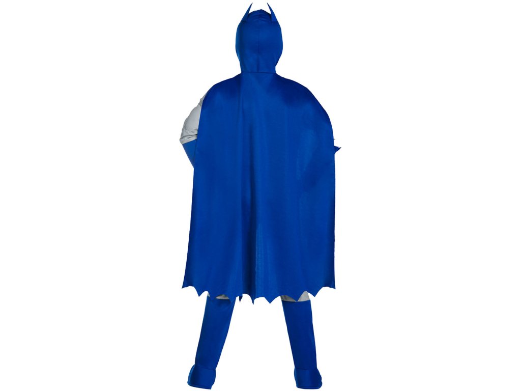 Dětský kostým Batman v modro-šedé barvě tvoří maska na hlavu s připevněným pláštěm, modré návleky na boty a pružný overal s vyztuženým hrudníkem a rukávy, který má 3D detaily na manžetách a žlutý pásek, velikost 140-152 cm (10-12 let). Balení obsahuje overal, masku s pláštěm a návleky na boty.