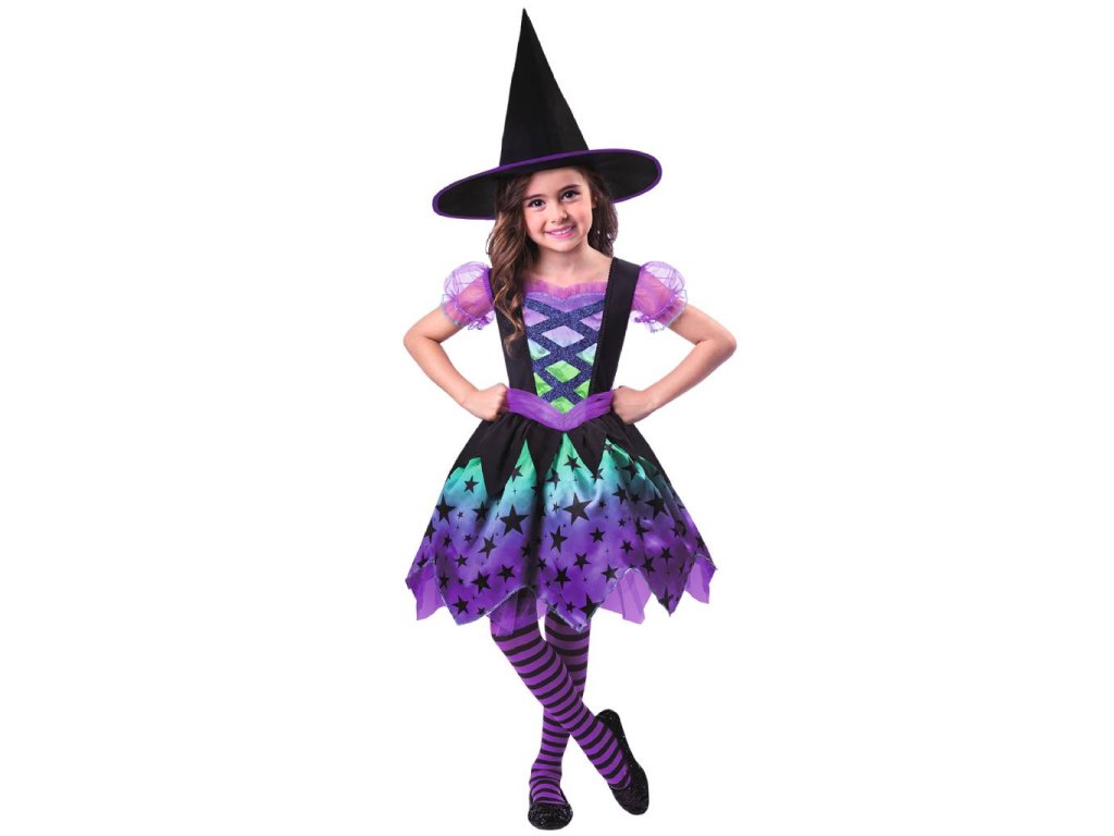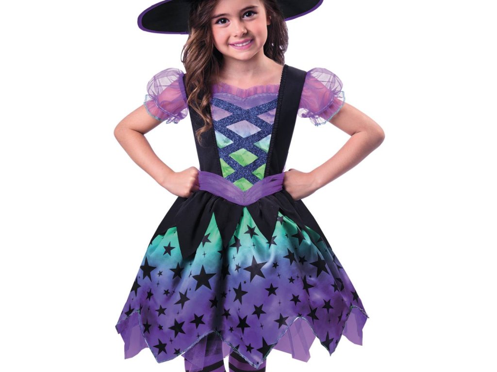 Dětský kostým Čarodějnice v černo-fialové barvě s tyrkysovými tóny, šaty mají průhledné balonové rukávy, zdobený top a barevnou sukni s černými hvězdami, černý klobouk je lemovaný fialovým proužkem, velikost 122-128 (7-8 let). Balení obsahuje šaty a klobouk (punčochy nejsou součástí balení).