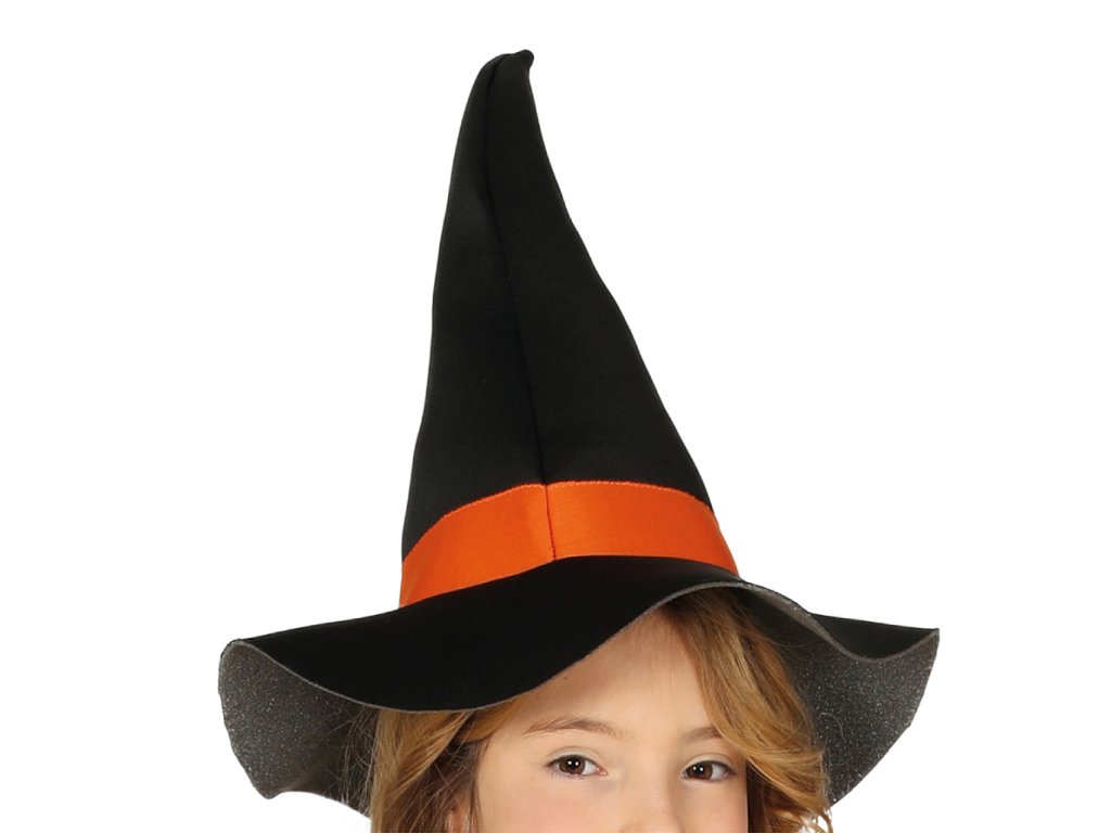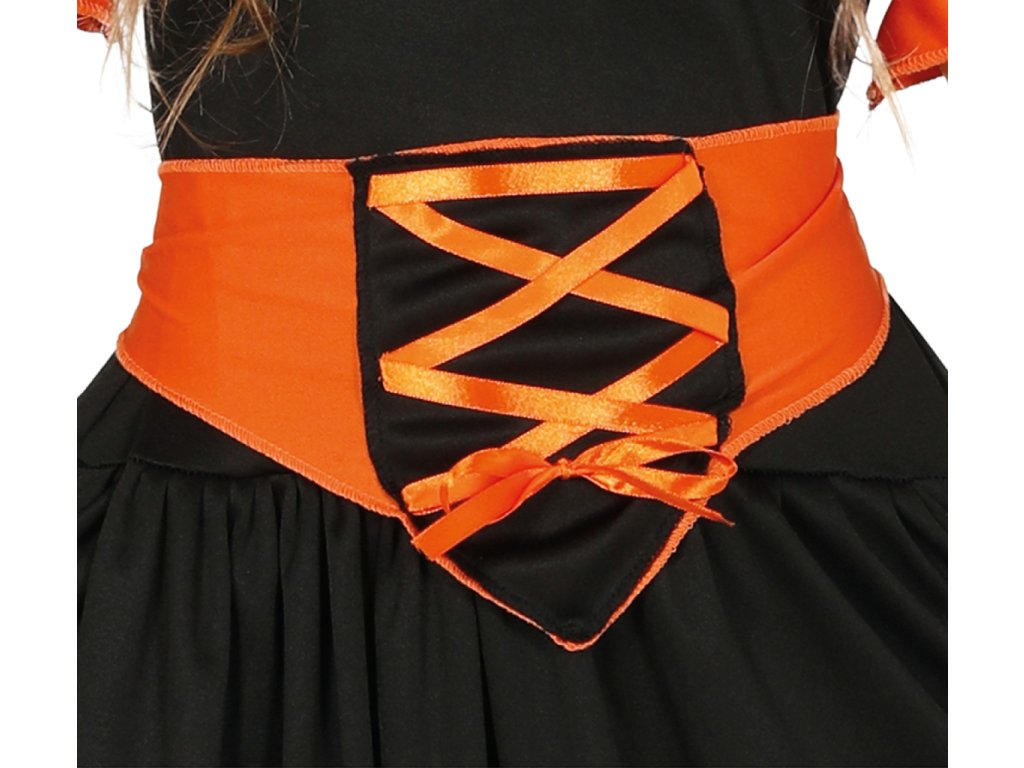 Dětský kostým Čarodějnice v černé barvě s oranžovými prvky a bílými lebkami, velikost 140-152 cm (10-12 let). Balení obsahuje šaty a klobouk.