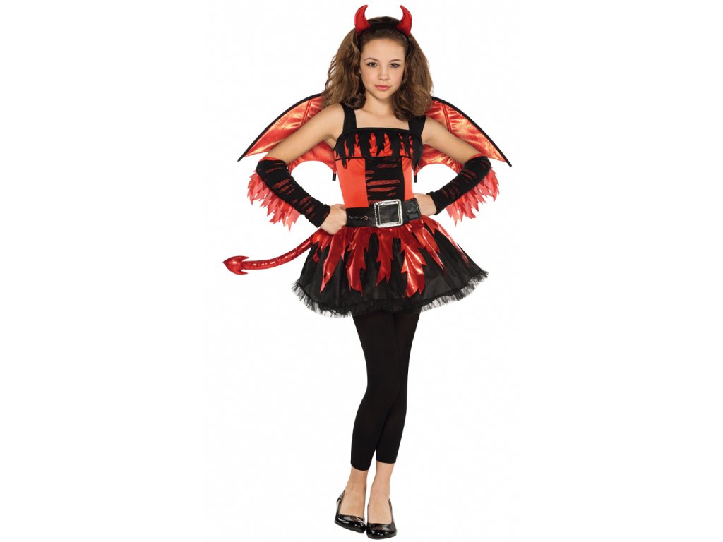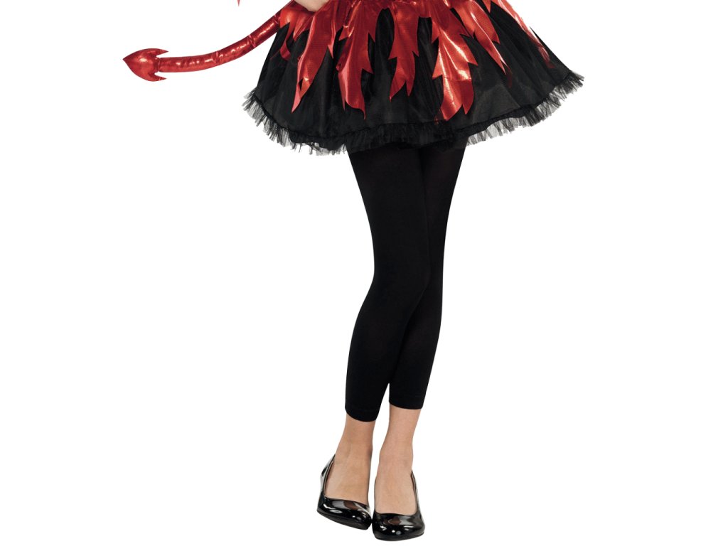 Dětský kostým Čertice v červeno-černé barvě, šaty s ohnivým motivem a připevněným ocasem doplňují křídla, čelenka s červenými rohy, návleky na ruce a černé legíny, velikost 128-140 (8-10 let). Balení obsahuje šaty s ocasem, křídla, čelenku, návleky na ruce a legíny.