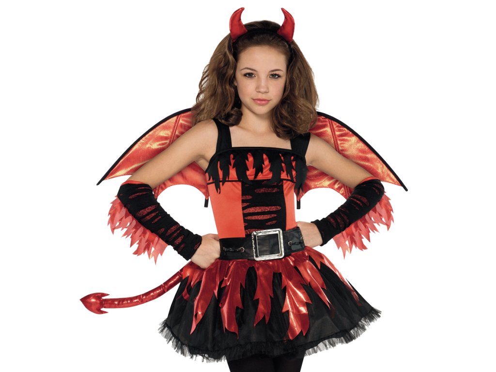 Dětský kostým Čertice v červeno-černé barvě, šaty s ohnivým motivem a připevněným ocasem doplňují křídla, čelenka s červenými rohy, návleky na ruce a černé legíny, velikost 140-152 (10-12 let). Balení obsahuje šaty s ocasem, křídla, čelenku, návleky na ruce a legíny.