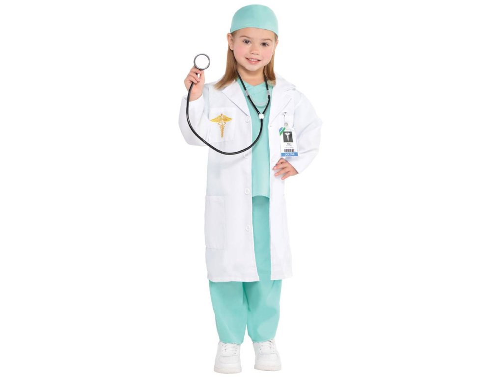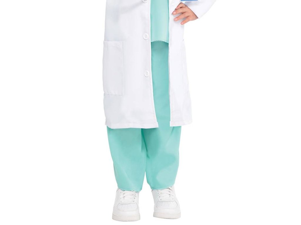 Dětský kostým Doktor / doktorka má vše jako opravdový lékař - zelenou pracovní košili a kalhoty, bílý laboratorní plášť se zlatou výšivkou, doktorskou čepici, stetoskop a identifikační visačku, velikost 116-128 (6-8 roky). Balení obsahuje plášť, čepici, košili, kalhoty, stetoskop a visačku.