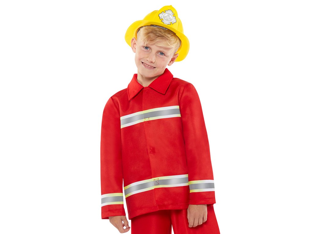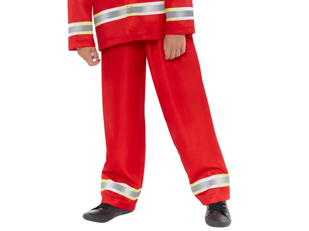 Dětský kostým Požárník tvoří červená bunda a kalhoty s reflexními pruhy, velikost 116-128 (6-8 let). Balení obsahuje bundu a kalhoty (přilba a boty nejsou součástí balení).