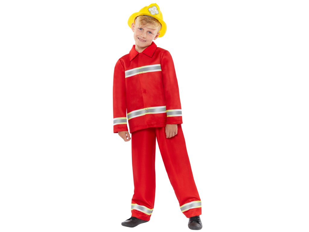 Dětský kostým Požárník tvoří červená bunda a kalhoty s reflexními pruhy, velikost 128-140 (8-10 let). Balení obsahuje bundu a kalhoty (přilba a boty nejsou součástí balení).