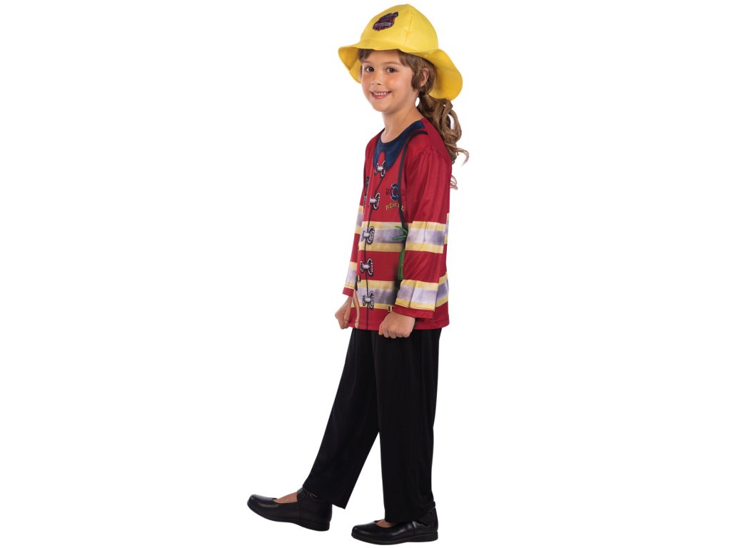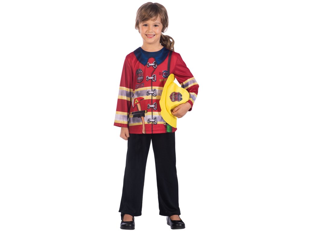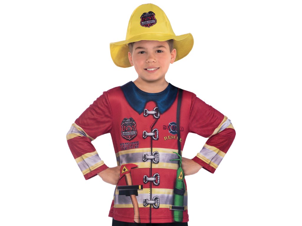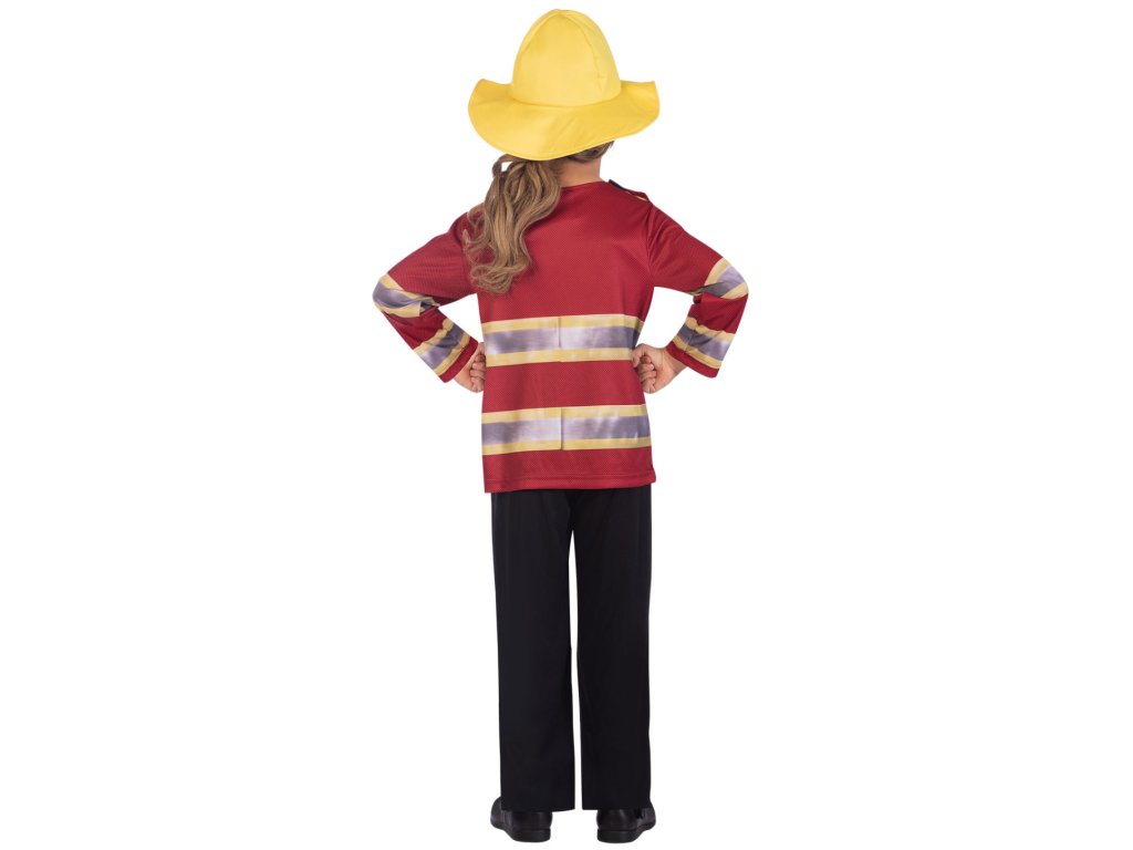 Dětský kostým Požárník / požárnice tvoří žlutá čepice v podobě přilby a červený top s potiskem a reflexními pruhy, velikost 104-116 (4-6 let). Balení obsahuje potištěný top a čepici (kalhoty nejsou součástí balení).