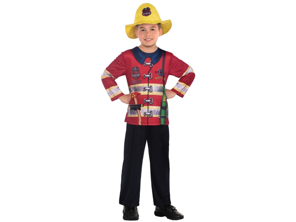 Dětský kostým Požárník / požárnice tvoří žlutá čepice v podobě přilby a červený top s potiskem a reflexními pruhy, velikost 98-104 (3-4 roky). Balení obsahuje potištěný top a čepici (kalhoty nejsou součástí balení).