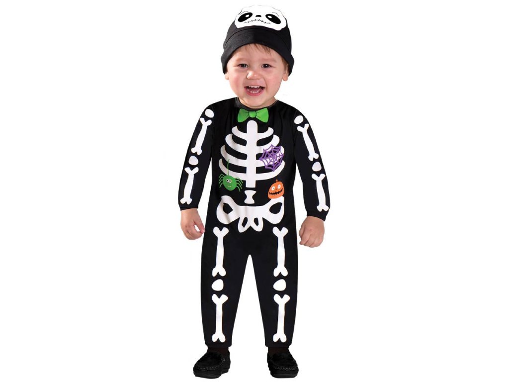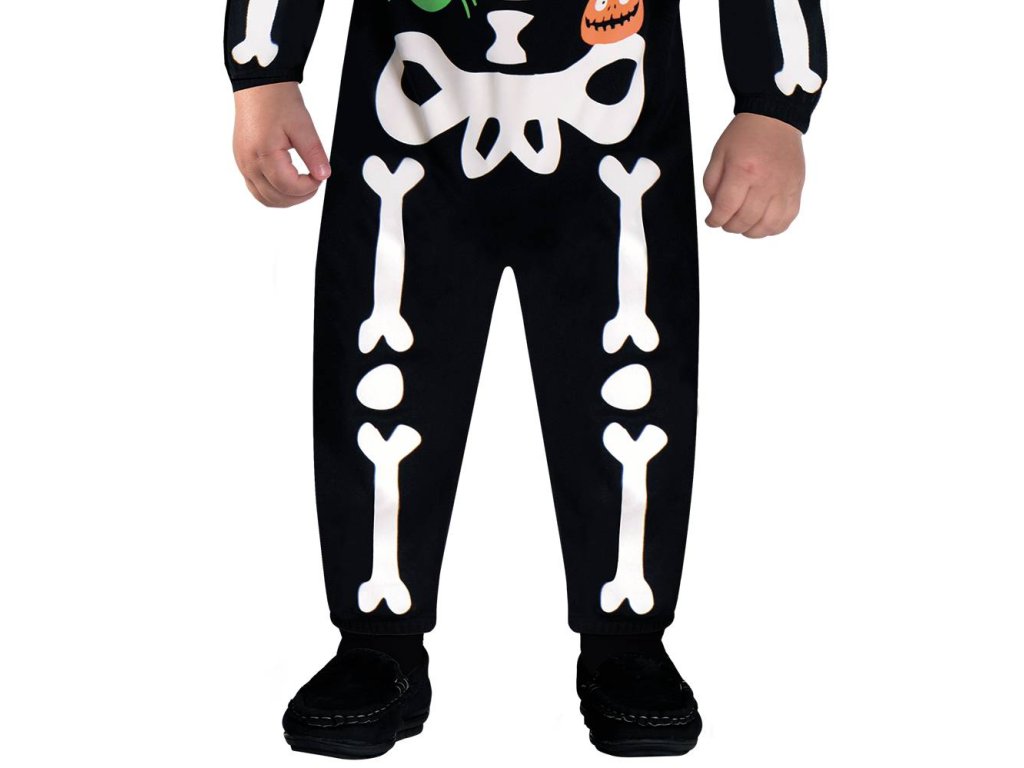 Dětský kostým Kostlivec je tvořen černým overalem s bílým potiskem kostry a barevnými halloweenskými obrázky a černou čepicí s bílou lebkou, velikost 98-104 (3-4 roky). Balení obsahuje overal a čepici.