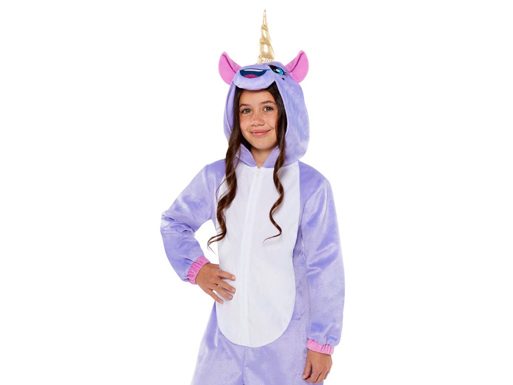 Dětský kostým Jednorožec ve fialové barvě s bílým břichem. Plyšový overal má na přední straně zapínání na zip, růžový ocas a kapuci zdobenou růžovými oušky, jednorožčím obličejem a zlatým rohem, velikost 98-104 cm (3-4 roky). Ošetření textilu: ruční praní ve studené vodě.