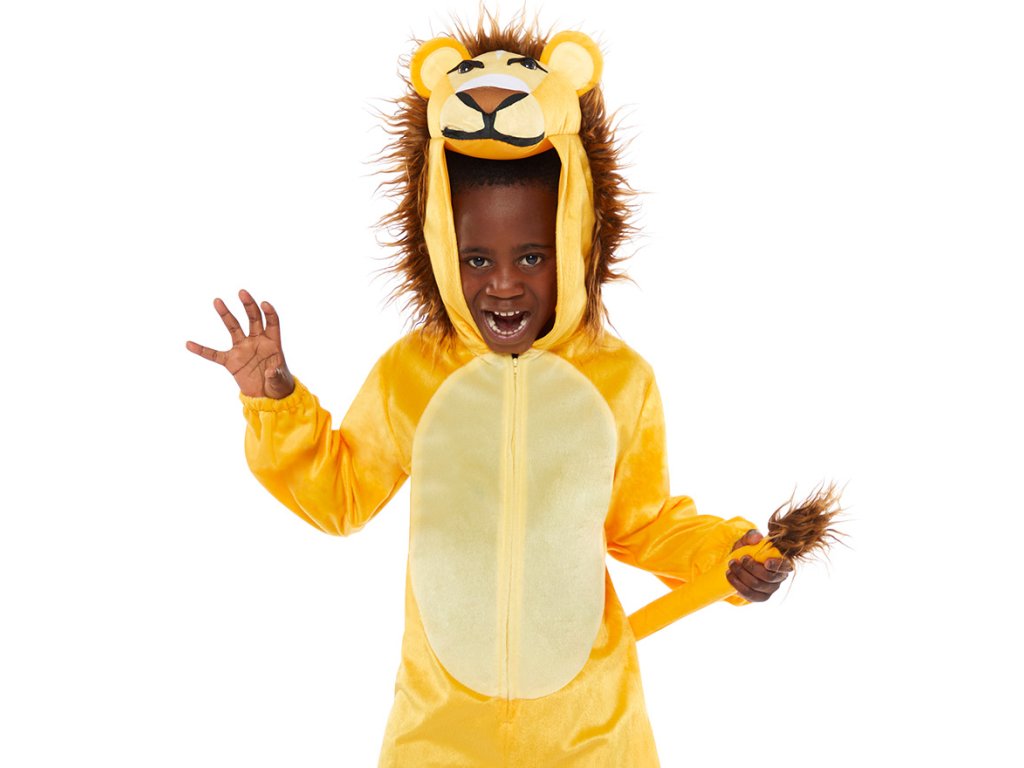 Dětský kostým Lev v tmavě žluté barvě se světlým břichem. Plyšový overal má na přední straně zapínání na zip, ocas a kapuci zdobenou oušky, lvím obličejem a hnědou hřívou, velikost 104-116 cm (4-6 let). Ošetření textilu: ruční praní ve studené vodě.