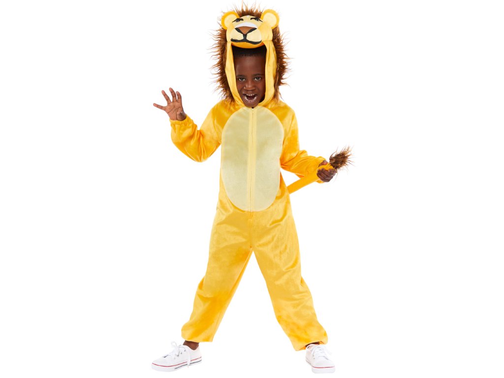 Dětský kostým Lev v tmavě žluté barvě se světlým břichem. Plyšový overal má na přední straně zapínání na zip, ocas a kapuci zdobenou oušky, lvím obličejem a hnědou hřívou, velikost 98-104 cm (3-4 roky). Ošetření textilu: ruční praní ve studené vodě.
