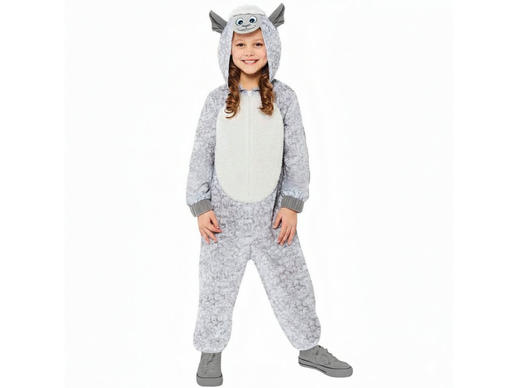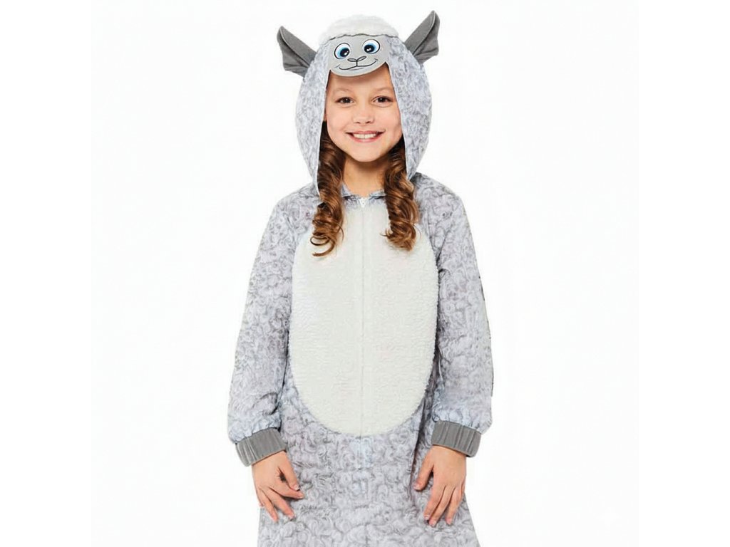 Dětský kostým Ovečka v šedé barvě se světlým břichem. Overal má na přední straně zapínání na zip, ocásek a kapuci zdobenou oušky a ovčím obličejem, velikost 98-104 cm (3-4 roky). Ošetření textilu: ruční praní ve studené vodě.