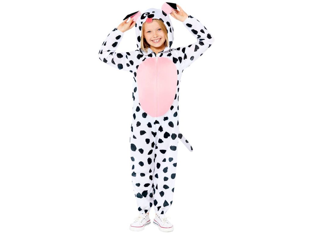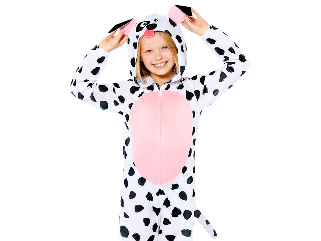 Dětský kostým Pejsek v bílé barvě s černými skvrnami a růžovým břichem. Plyšový overal má na přední straně zapínání na zip, ocas a kapuci zdobenou oušky a psím obličejem, velikost 128-140 cm (8-10 let). Ošetření textilu: ruční praní ve studené vodě.